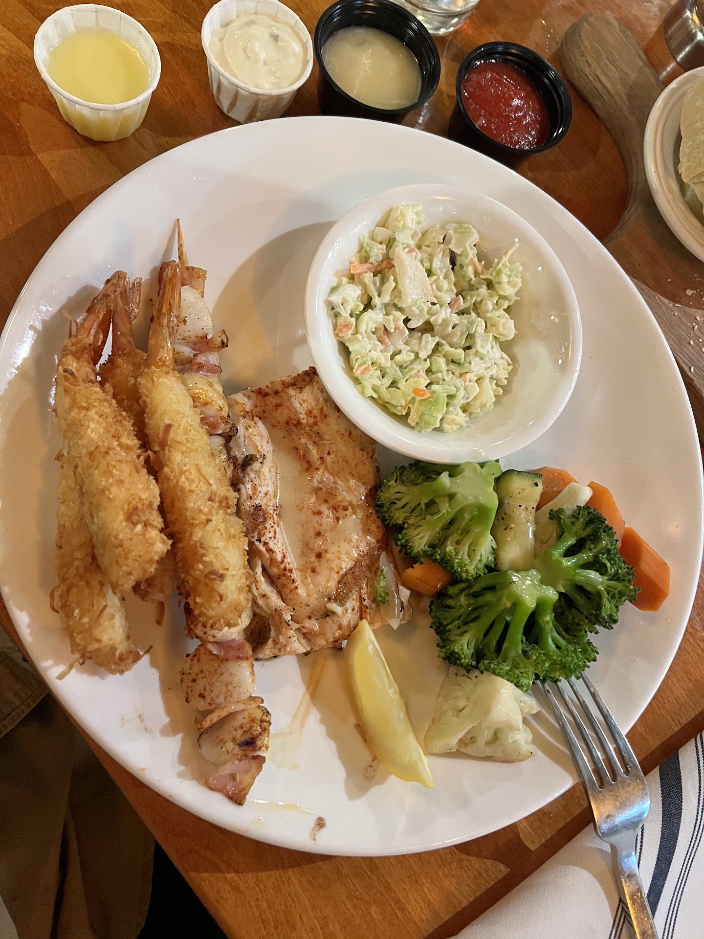 I had ordered a create your own combo with two items, item 1, Mahi-Mahi, item 2, Bacon wrapped scallops, I added a 3rd item, add an additional cost of eight dollars for golden fried shrimp, The two side dishes were coleslaw and chefs choice mixed vegetables.