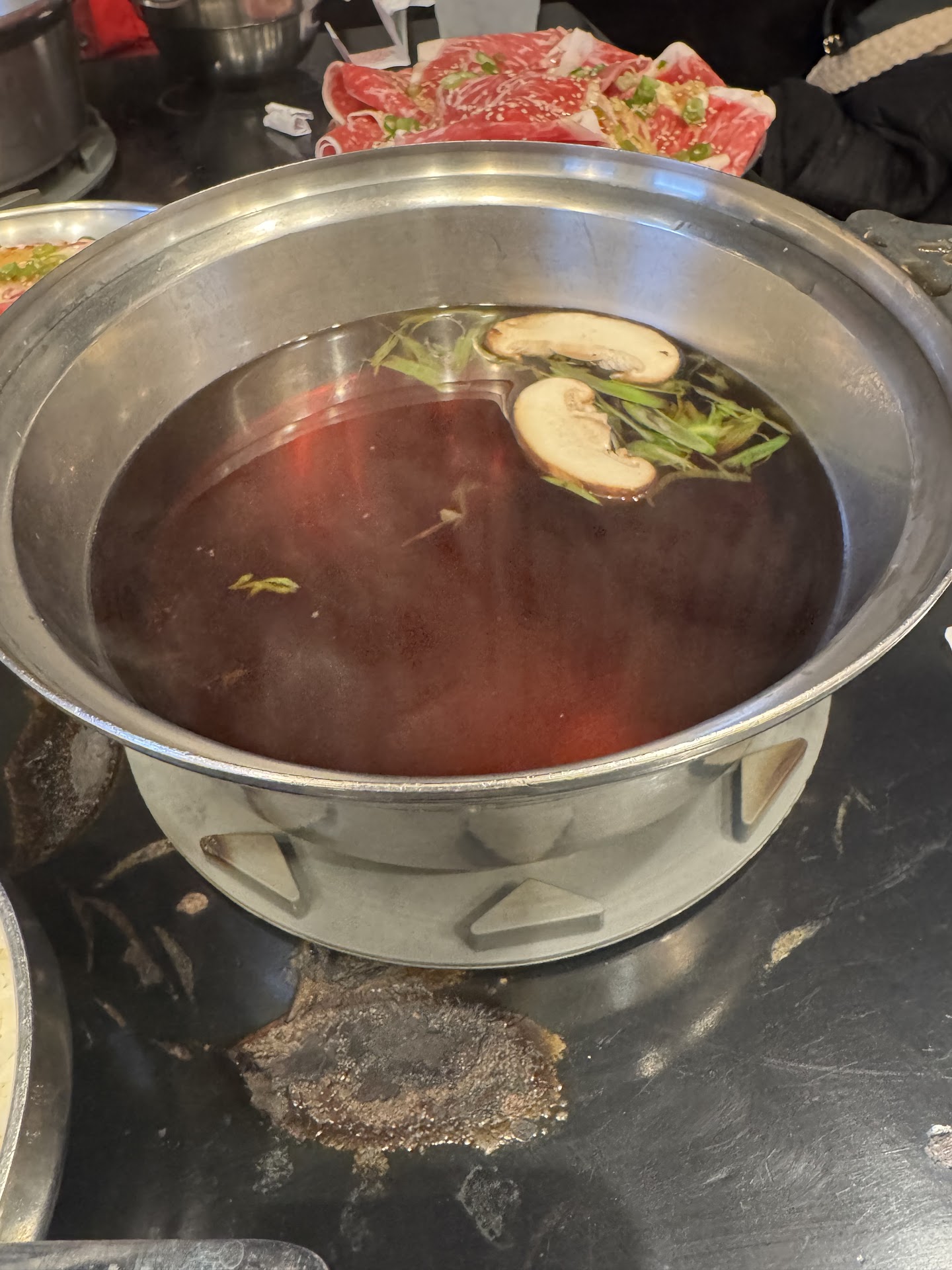 Read moreAfter reading the review from this restaurant I want to try out this place. It’s my first time coming here. Btw we got there around 7pm and 20 minutes later two people came in suddenly got their seats before us. Beside that I never got an explanation from my server if he ask me it’s my first here or would you like to explain how we order your food. I order a spicy broth with beef belly. The spicy broth nothing special just water with spicy powder. I thought I would have more flavor in the broth and vegetables was okay. As soon as I got my broth and meat. I dip my meat and bowl of broth was cooking like other patrons. I had to as the server if I need to turn on something the bowl. Luckily a patron explain there is a setting on the table to cook your bowl. I would rate this place 4/10. I won’t come back to this restaurant. I would rather try a traditional hot pot restaurant. Also they forgot my noodle before I...
