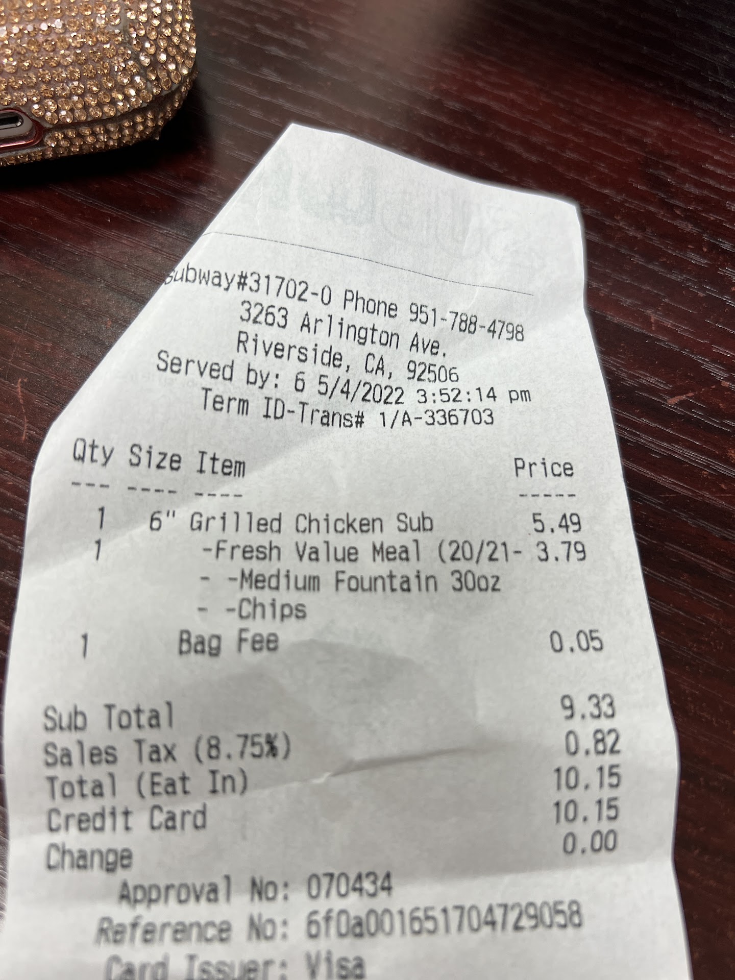 Read moreWalked in today approx 3:52pm Whomever was serving at that time didn't exchange gloves with the customer prior to me, until I told her to do so. She had grabbed my bread and chicken to toast it and then walked to the register putting her hands to add item so I can be charged, when she took sandwich from toaster she asked me what veggies did I want, I noticed she was going to use the same gloves and her glove finger tips were dirty. I told her to switch her gloves and she got bothered about the suggestion and provided bad customer service. I am disgusted....