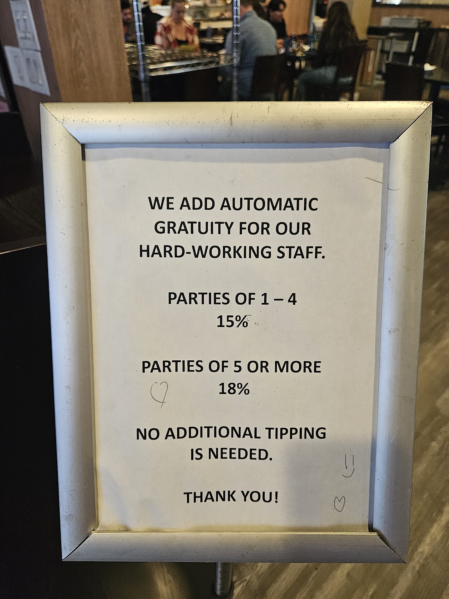 Read moreThey charge a 15% gratuity automatically for their hardworking staff. 18% for 5 or more. We stayed optimistic but truth be told this rubbed us the wrong way right after we saw the sign but again stayed optimistic and my son really wanted to try this place. The host sat us and told us to use the QR code for the menu and write down what you want on the paper. This is normal for alot of sushi places. But to be fair I'm already doing part of your job for you which would have been ok had our server been observant and attentive. He came to our table and he was really nice. He took our drink order and I told him that we had 2 more coming. He dropped the waters off and when my son came and we waited a while and then he came and took our order. we noticed that we only had 2 plates so we waited for him to come back. My son also wanted to order another drink but we still waited for him to come back. Finally we were looking around as he was helping all the tables around us but we couldn't flag him down because he kept walking the other way and we still waited for him to come back. Finally, The host saw we were looking around and brought us more plates and Wasabi. We still waited for our server. Then a while later a guy came and dropped two rolls. And then another guy came right after and dropped 3 more rolls. We were still waiting for our server. We were finally done eating. No server. Finally I got up went to the other host and told her that we needed the check. I said that we haven't seen our server so why do I have to pay a 15% AUTOMATIC GRATUITY for a server I haven't seen since he took my order? I'm not doing that. But that girl (me pointing at the host) over there has helped us more than he did. I'm pretty sure she was caught off guard with my question so I said If we could just get my check I'm sitting over there. ( I did not sound happy it was obvious but who would????) Then the server miraculously comes by and asks if we are good and I just said we wanted the check. At this point I wanted nothing to do with the server. KEEP IN MIND THAT I STILL LEFT THE 15% TIP. WHY? BECAUSE IM NOT JUST AN A-HOLE WHO DOESN'T WANT TO LEAVE A TIP.... I ALWAYS LEAVE A TIP AND IF YOU ARE AWESOME THEN I LEAVE MORE THAN 20%. IM A PERSON WHO IS TRYING TO MAKE THE POINT THAT: you were barely serving us, you were barely there throughout the experience and you expect me to pay you for a service you did not give yet alone live up to the "hardworker" your company claims you are to be. But I tipped because I'm not trying to get out of the tip I am perfectly capable of paying my way and giving tips where it is deserved. You did not deserve it but I did it anyways.