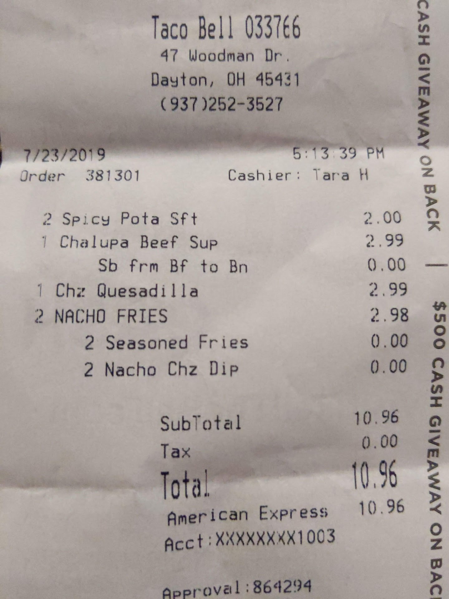 Read moreI literally waited 43 mins in this drive thru. The drive thru literally keeps you in it whether you wish to leave or not. Sat at the window for 15 mins before even taking my order. Literally finally get to the window I see 5 young people working and laughing. One guy scratching his behind the desk. I thought maybe someone didn't come to work might be running short staff , smh not the case. Take my card hands it back shuts window no receipt.Then finallly hands me my food shuts the window didn't offer sauce forgot my cheese so I waved for assistance as they laugh amongst each other so I can get my sauce and cheese for my chips. Then some kid from the back had to show the person how to print my receipt đ€Š what a joke. People just don't take work serious anymore and still getting a paycheck. Get home 46 mins later no napkins , and 4 pops...