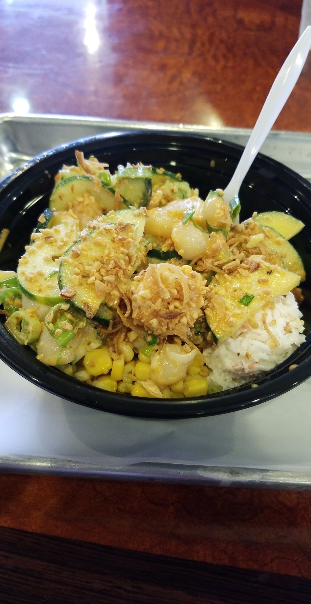 For my order, I went for spring mix, spicy tuna & scallops. I loved all of the traditional poke toppings but this place also offered corn and hot cheetos as a garnish (my daughter loved that).