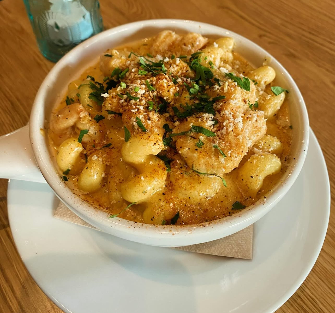 We were missing some protein so we added chicken for an additional charge - I think that was an extra $6. We suggested to the server that it could be served with a piece of bread. She said it would cost extra for some bread. It's real creamy and has some cheese pull and a soup-y texture when it's fresh and hot, so bread would pair well.