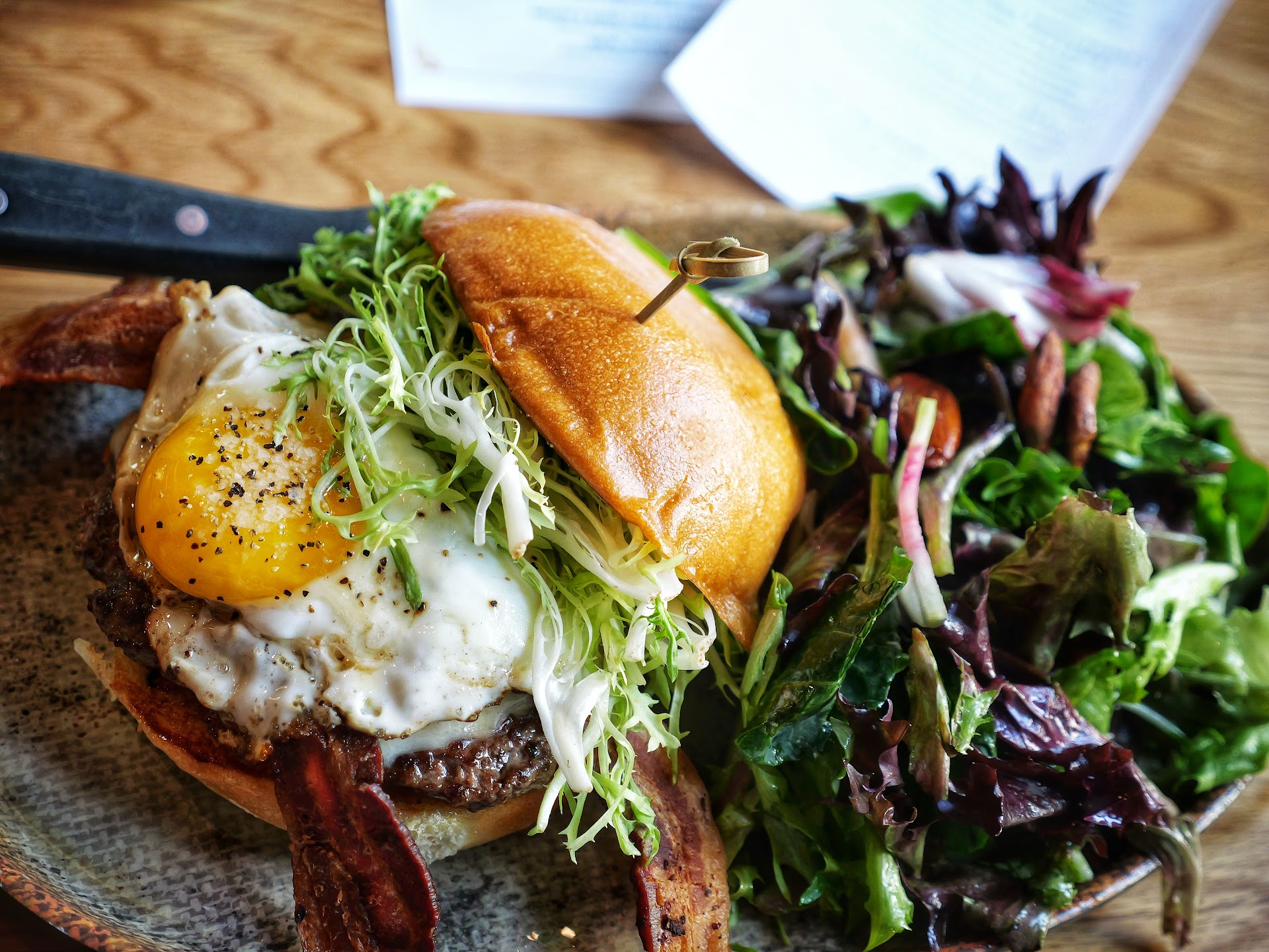 This drunken pig burger is also served with the State's house salad, topped with candied almonds. Super green like a field greens salad.