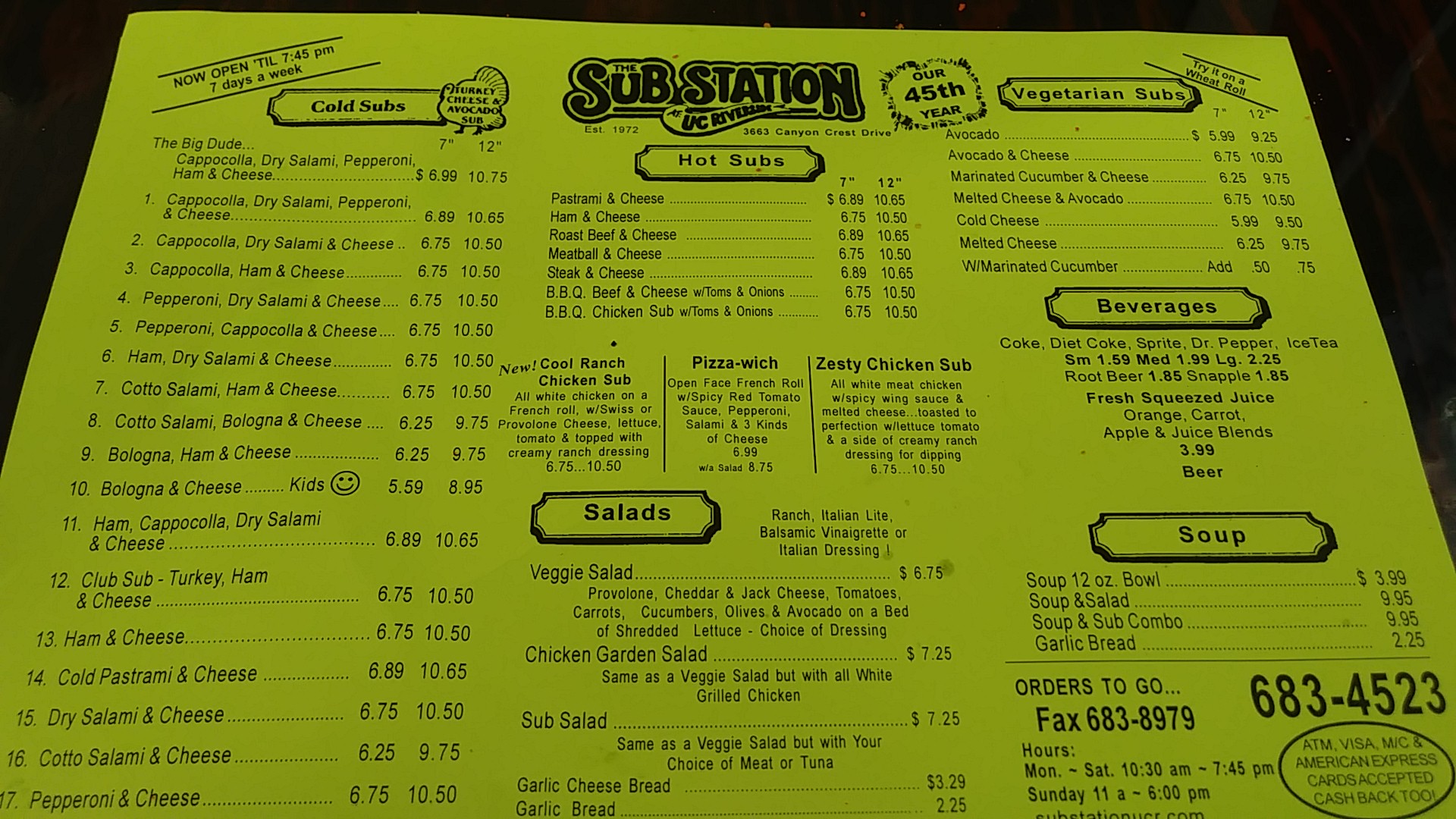 Read moreSub Station has been a local sandwich hangout since I was in high school in the late 1970s and early 1980s. From the get-go, I thought these were the best grinders I've ever had. In the 30+ years that this family-owned restaurant has served the community, the quality has been consistent. The price may be a bit higher than most subs, but the taste and quality is worth every bite. And the variety of choices is plentiful. My fave is #3 on the menu, cappicola, ham, and cheese 😋 Plus, the ambience is friendly and has that college feel—the Station sits right across the street from the UC Riverside softball field and track and field area. The servers are usually college students from the Riverside area and are amiable...