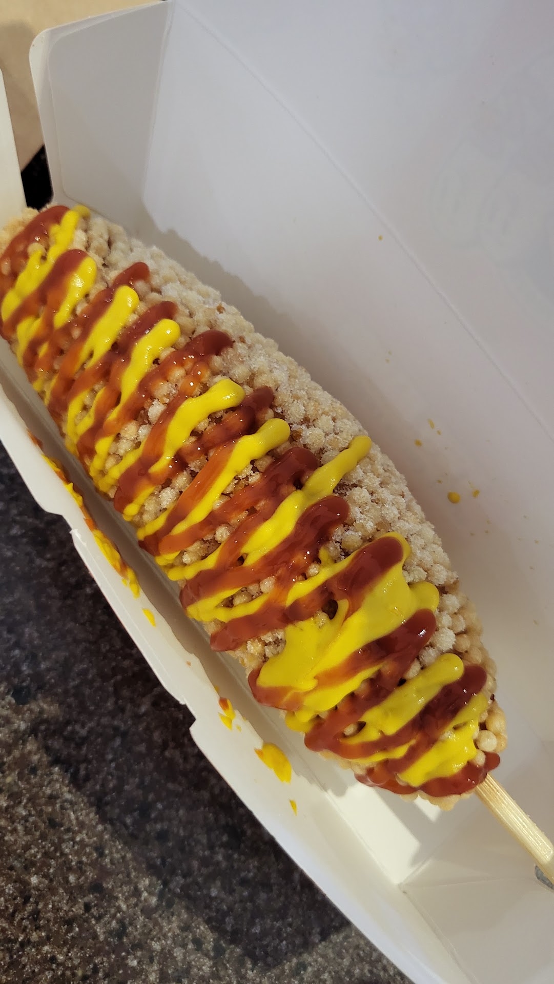 Waste of money and time. We were really disappointed. These have nothing to do with "corn dogs" there's no cornbread involved, only a yeasty white dough that the dog is swathed in and rolled in crumbs and fried. The bread dough was bland and undercooked and chewy, no flavor like a corndog. You can't call them a corndog if they are not cornbread. Second, we found that the ingredients on top were just too much. The bread was annoying gross and the potatoes or other toppings were too much trouble and also bland. We had to wait 30 minutes in line to receive our order too, while watching this horrifically disgusting video of people trying to eat their "corndogs" in the most disgusting and messy way. Really who wants to watch a mouth zoomed in and eating with their mouth open and stuffing as much food in it as possible? It was so gross to watch while waiting for our food. We ended up taking the dough and breading off our corndogs...
