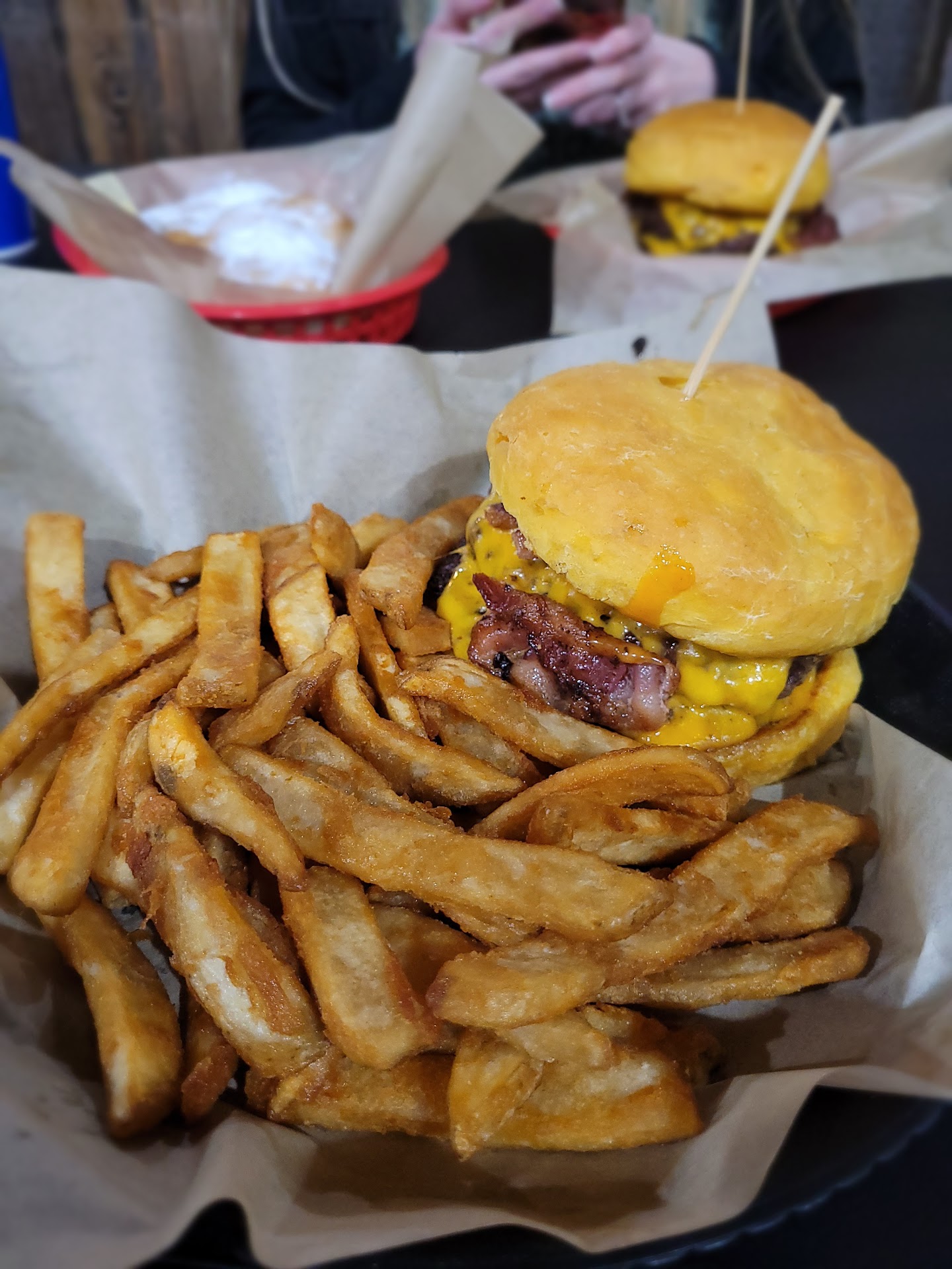 To start, the burgers are very good and fresh. Great sear on the patty, melted cheese, bacon crispy, and a good bun. The bun could use more toasting as the burgers are on the greasy side. It gets just slightly soggy a little quickly. The real only complaint I have is the burger patty itself, as fresh as it is, it needs that more seasoning to bring it fully out. Still would absolutely choose this over a Five Guys, and for this price, easy.