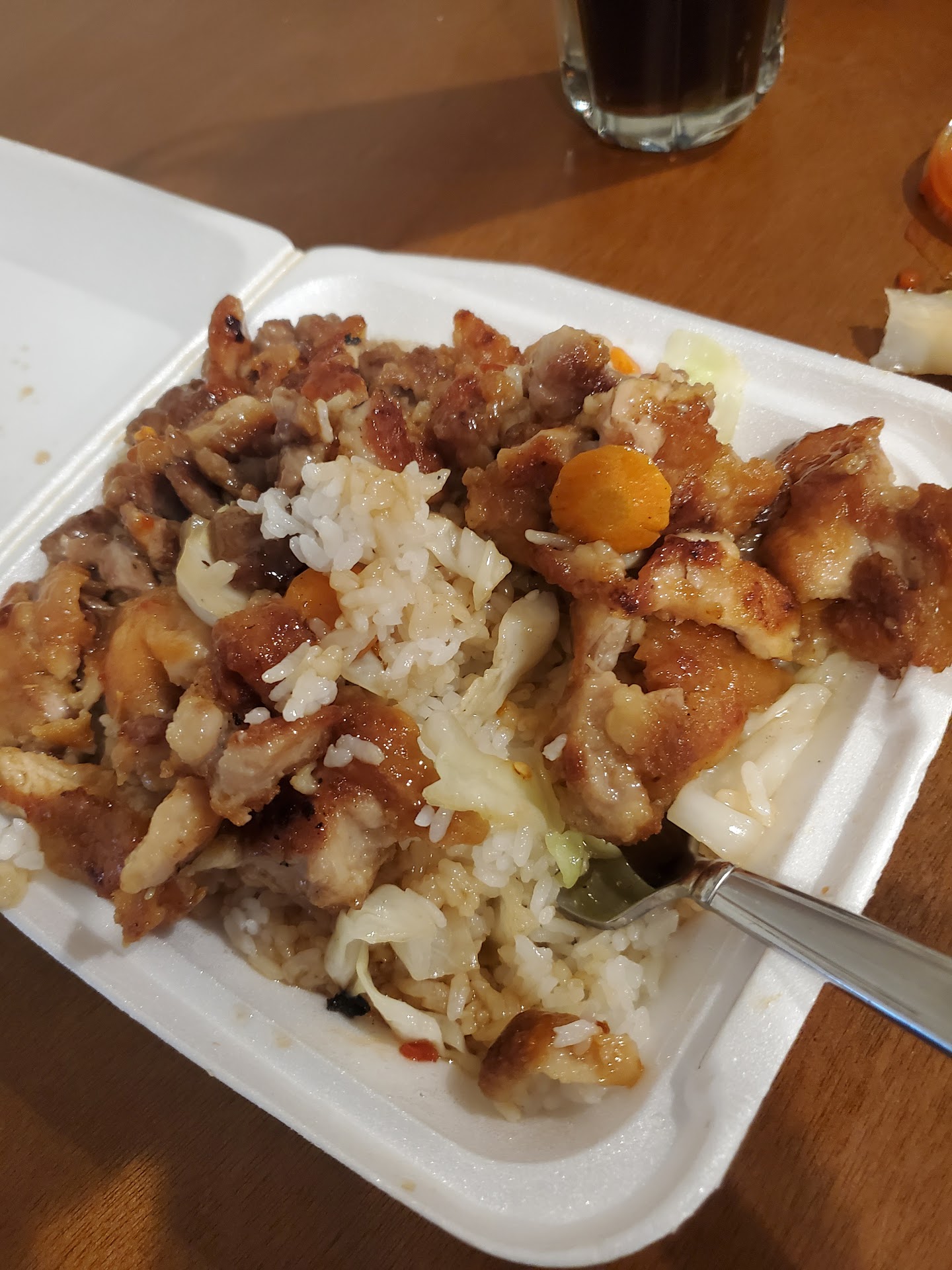 The food was okay but when you see something that says "fresh vegetables" you expect something more than steamed cabbage. Now I happen to like cabbage so no big deal but if I hadn't had one slice of carrot included, I would have cried foul for false advertising. Steamed rice was exactly as expected, just plain white rice. I should have at least tried the fried rice to see if they know how to do that well.