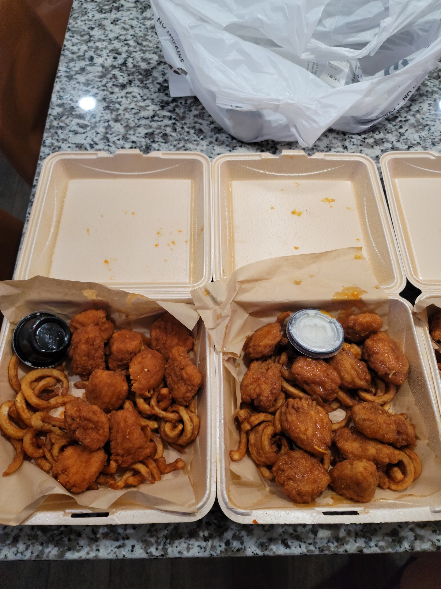 What I ordered and what I received were two totally different things. I ordered a 22 piece boneless wing and an 11 piece boneless wing, both with curly fries. What I got was overcooked nuggets with a splash of some sort of sauce on them and regular fries.