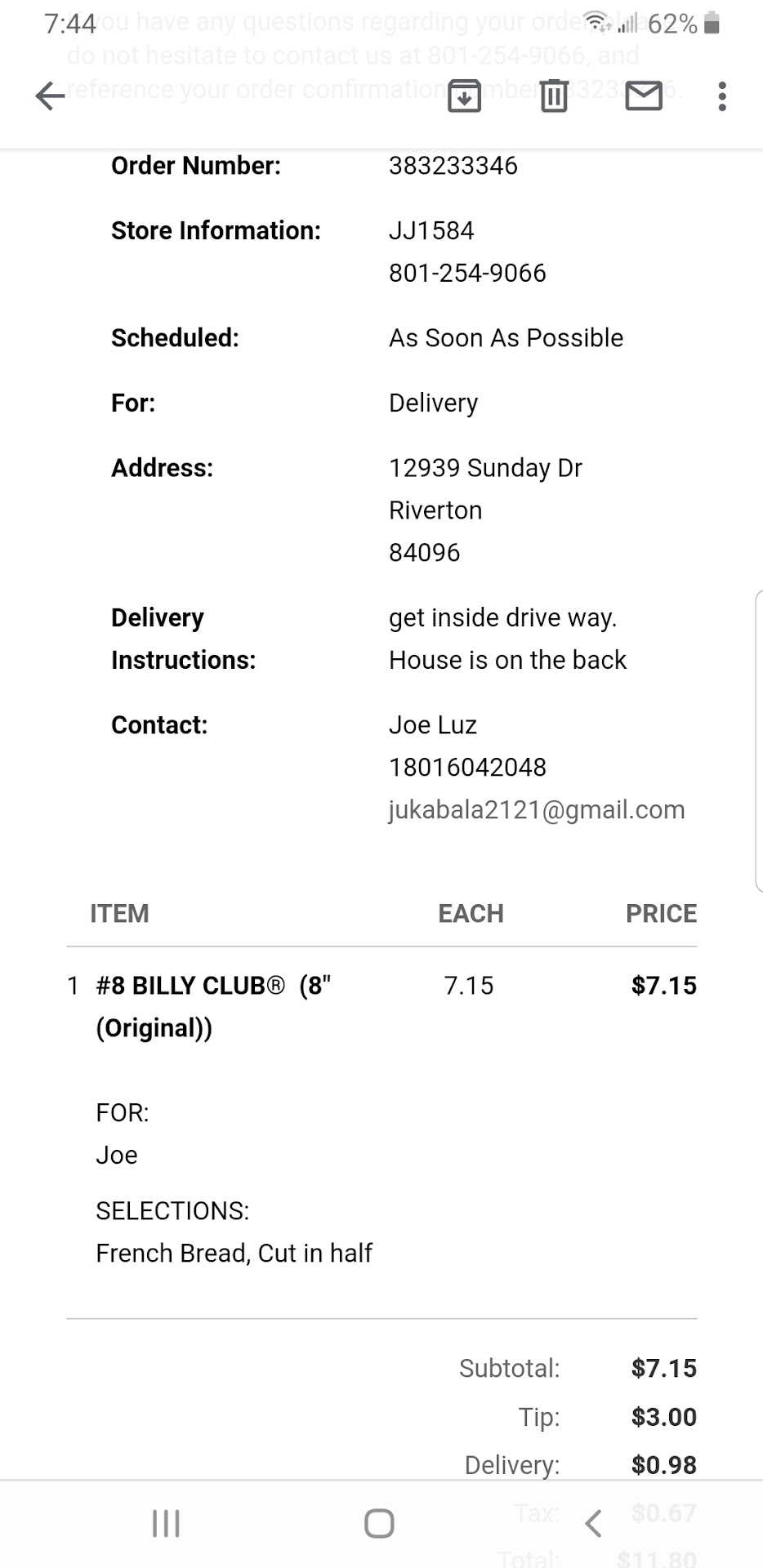 Issues this time- -actual delivery took just over an hour. -we called half an hour after the "out for delivery" notification and were told the driver had left but it would be up to 30 more minutes -the bread was soggy since they were sitting for so long -nothing cut in half as requested -only half of the sandwiches were marked as to what they were