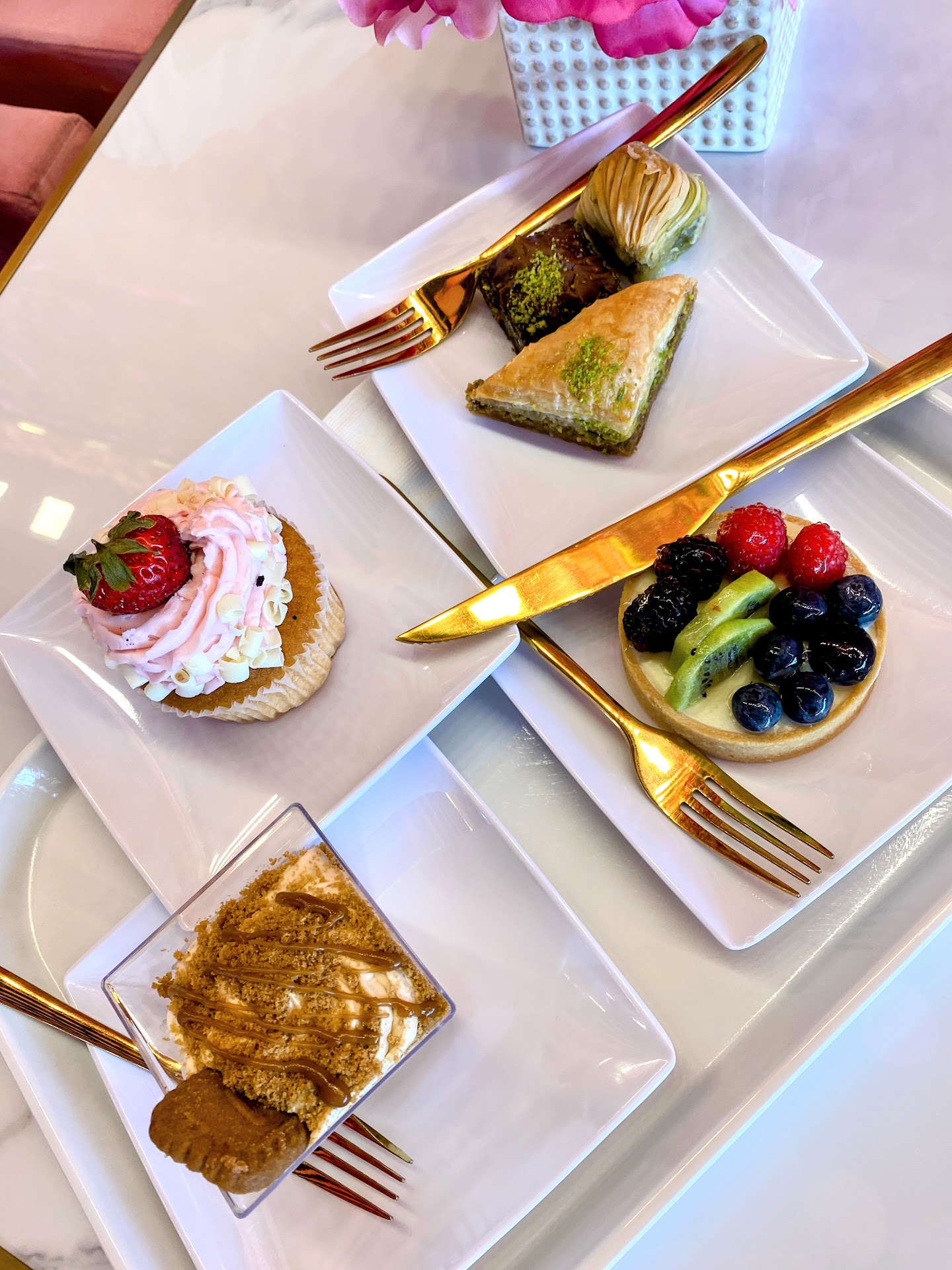 Read moreMy girls peeked in last week when we were running errands nearby and they had the doors propped wide open. This cafe is so darling we decided we needed to come back to check it out. When we returned, I expected maybe something like one of the many other dessert stores popping up everywhere - when we walked in and saw the huge variety of BEAUTIFUL decadent desserts we were blown away.This is not a donut or cookie shop - These were some of the most gorgeous, incredible desserts I’ve ever seen. And there were dozens and dozens of varieties. There is a whole case dedicated to baklavas! (The triangles and chocolate are amazing.) We enjoyed a fancy strawberry shortcake cupcake, a fruit tart, baklava, and a biscoff cake cup - they were all works of art and tasted heavenly. I hope this place does well and stays in Riverton for a very long time because it is a GEM. A great place for a date night, special girls’ lunch or outing, or a meet up with friends and they also cater. (Their menu includes some breakfast items, sandwiches, and specialty fruit drinks I would love to come back and try.) The atmosphere is fun - and of course - very pink! The plush pink chairs with pillows, the gold utensils, and rose covered walls make the atmosphere feel as fancy as the desserts. If you ever go to Zen Nails next door for pampering - do yourself a favor and pick up a fancy drink or dessert on the way to make your outing even more amazing! 😃 Highly,...