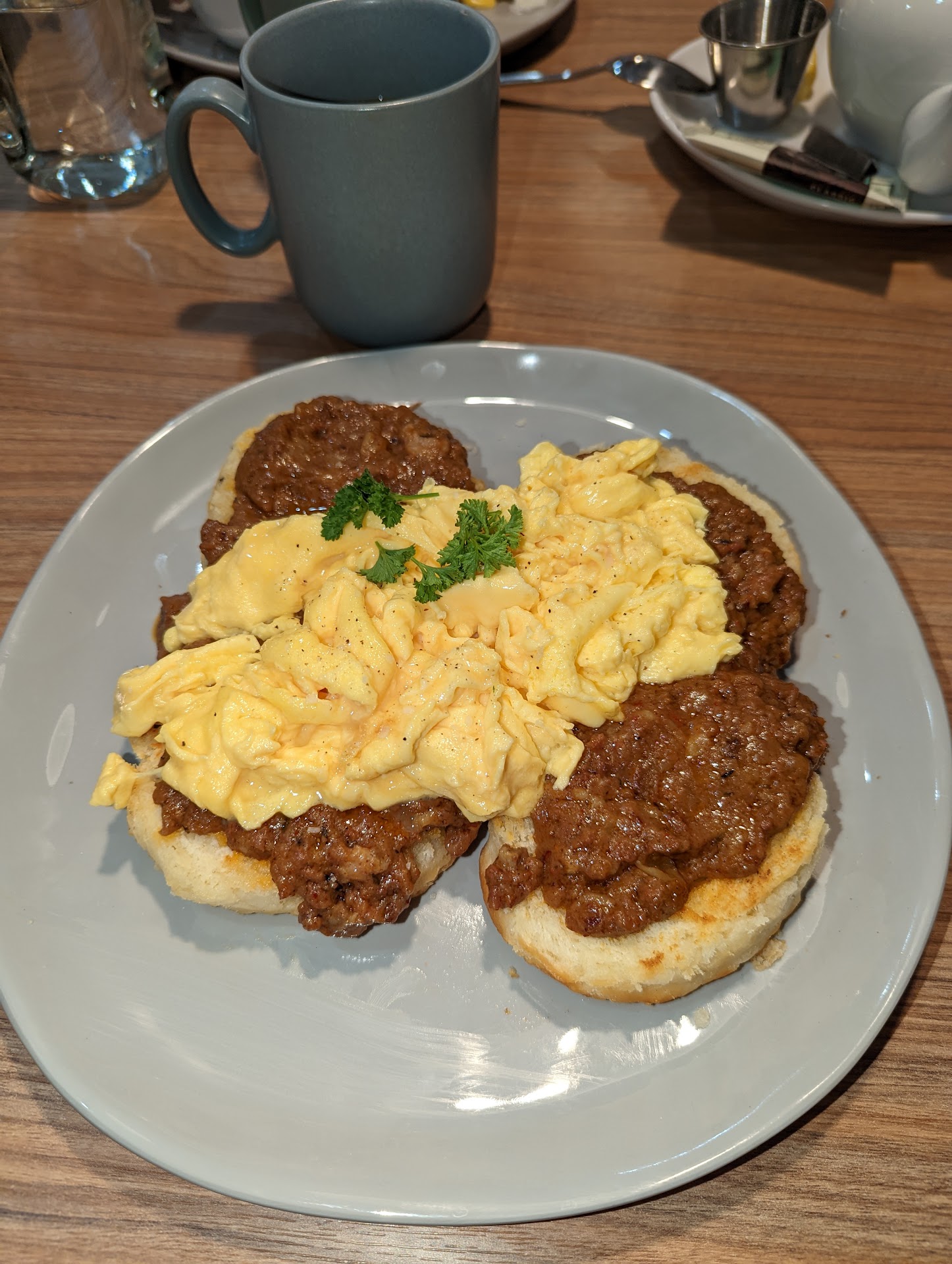 One Corned Beef Hash with two scrambled eggs, hash browns, and a side of pancakes, eaten but not commented on by their diner, who also wasn’t me. Much of it was taken home and I tried it and the leftover pancakes. The corned beef hash was utterly Hormel-y. The hash browns had dried overnight. The pancakes were a different story. They held up very well as leftovers but were quite doughy.