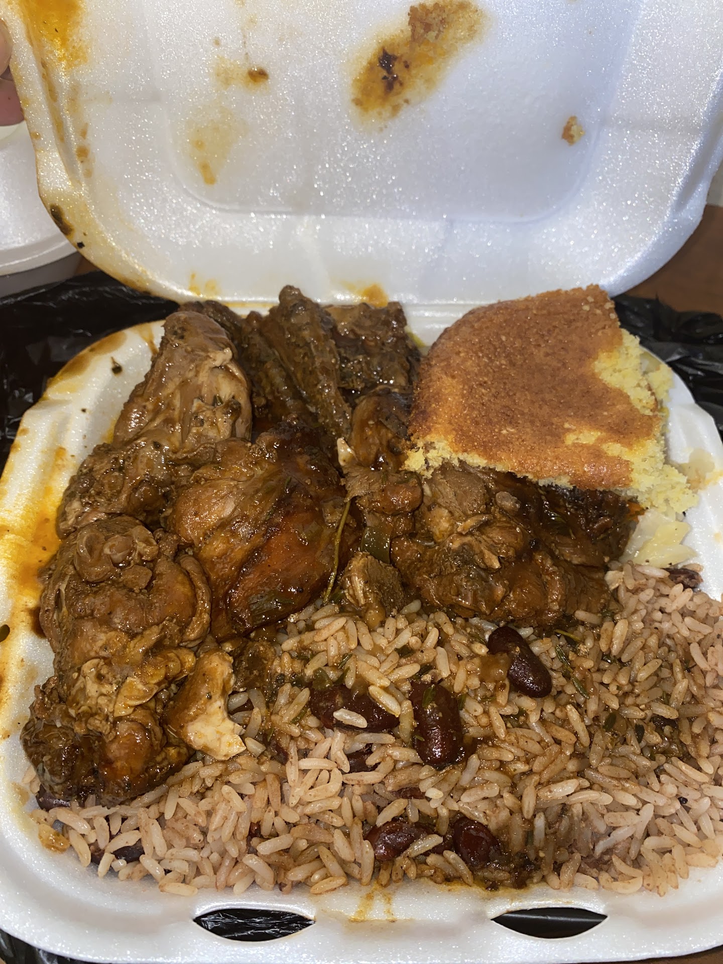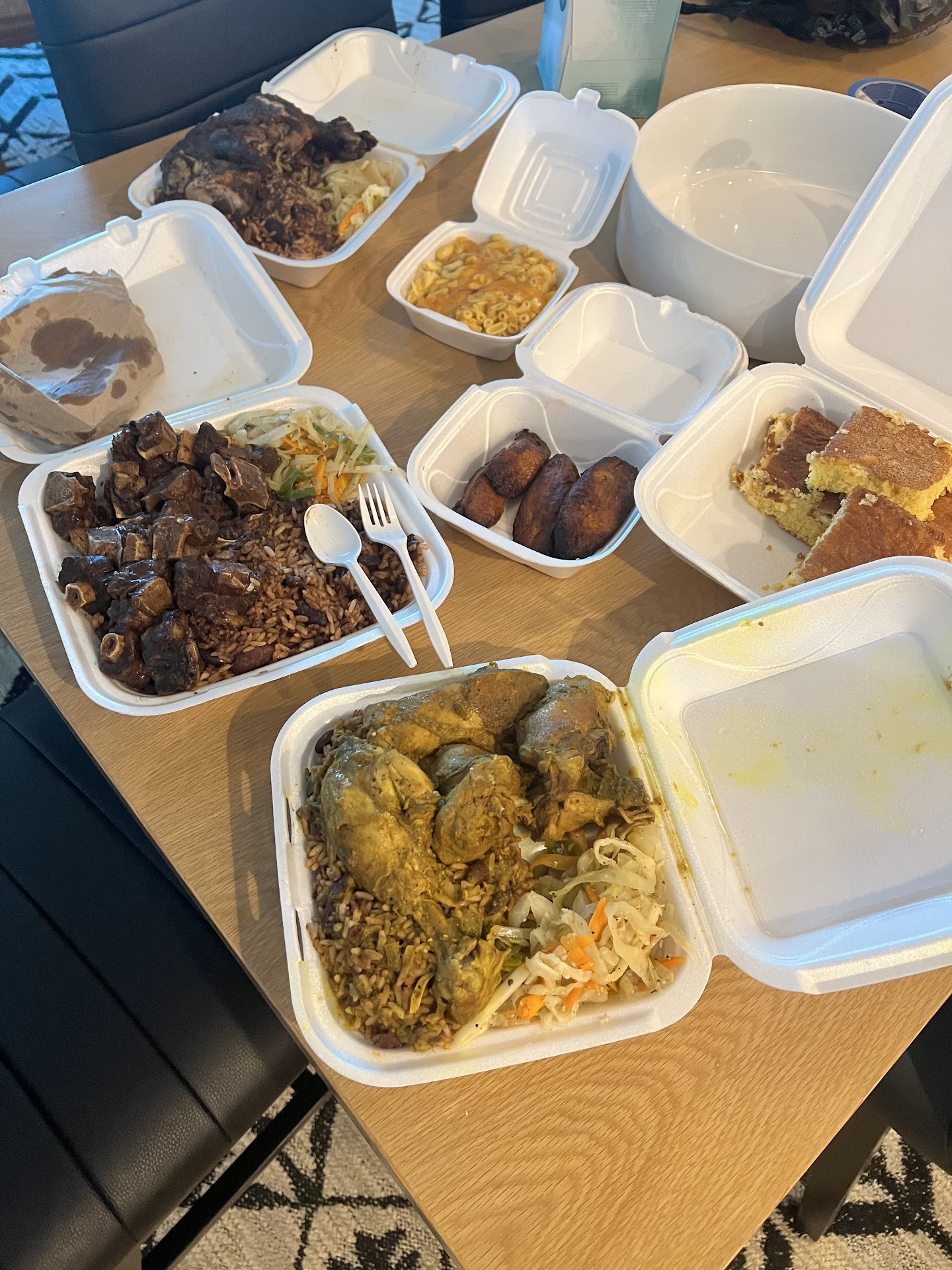 Ā Ā Ā Read moreI was genuinely impressed by the service, flavor, portion sizes, and overall value. Feeling indecisive due to my hunger, I ended up ordering several different dishes, anticipating something truly remarkable. My favorite Jamaican dish is oxtails, and they did not disappoint. When I opened the box, I was taken aback; many restaurants only give you about five bones for a large order, but this plate was generously filled! In fact, by the time I took the picture, I had already enjoyed 4-5 bones. Everything was delicious, especially the rice and peas, cabbage, mac and cheese, spicy beef patties, and plantains. The cornbread was fantastic, tasting more like cornbread cake! The jerk chicken had the smoky flavor and seasoning I love, although it was a bit wetter and cooked longer than I prefer. The curry chicken was flavorful, but I wished for a bit more gravy. This isnāt a complaint, as everything was excellent. The location is a cozy "hole in the wall," and the woman who served us was kind and attentive. If you decide to visit, don't miss the 2-for-1 specials. I have plenty of food to...