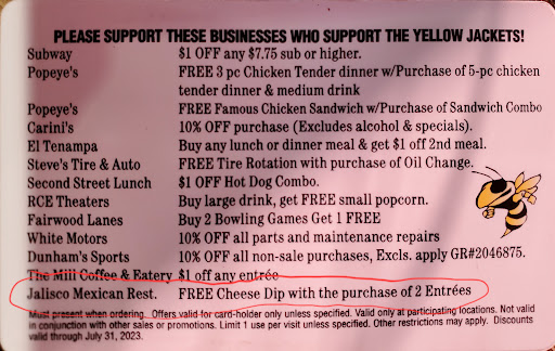 Read moreMy daughter & I visit at least once a week, sometimes twice. The food is usually very good. I know they are understaffed at times so I don't even complain when my order isn't right. Portion size is good. The service is usually good, depending on the server. Sometimes it can be not-so-good but I don't complain. During my most recent visit, I presented my discount card for a free cheese dip with the purchase of two entrees I had three entrees on my ticket. My server came back to the table & informed me that I would have to purchase two drinks to get the cheese dip free. I showed him what the card said and he repeated that I would have to get two drinks. Normally, my daughter orders tea but during this visit we all ordered water. The manager/owner came over and said that the offer was not printed correctly on the card and she asked that they be corrected. I think it is unlikely that they will reprint a fundraiser card. Anyway, the manager/owner took the cheese dip back since I wasn't buying two drinks & didn't wish to pay full price. I have encouraged so many people to try this restaurant and treated many people to dinner here. This most recent experience put a bad taste in my mouth. I don't ask for my money back or complain when my order isn't right and they made a big deal over cheese dip. I do not know if I will return to this restaurant any time soon or at all. They do have the best Mexican food in the area but customer service is very...