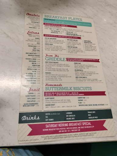 The first thing we noticed at this packed restaurant on a Sunday after around 1230 was the people were friendly ! Smiling faces from patrons and workers as we, strangers, walked in. Homemade cakes/pies/banana pudding on the counter. 50s feel with teal walls and leather type material for booths and seats for tables. The waitress was friendly and patient with all my questions. The lady that was busting tables was a hustler with a smiling face. I'm sure every restaurant wished they had 10 of her just looking at her work ethic. The guy sitting beside of us was very friendly and answering my questions on "what's the community favorite." My ham, mashed potatoes, and corn pudding was good. My extra bowl of chicken pastry was awesome! I took it to go for my dinner tonight ๐. So.... my husband's review brought it to 4 stars. They were out of chicken gizzards, Texas Pete, and his stewed tomato's was on the sweet side for his liking. But he did enjoy his black-eyed peas, cabbage, and collards. He suggests requesting the onion and vinegar for these. I was saddened that they don't have milkshakes anymore. The equipment is broken and not in the budget to fix, BUT I hope this little gem gets the business they need to fix this!! A 50s diner needs milkshakes, haha. I hope this review has helped you decide. We will be going back on our next pass thru. Oh....I'll update the review on the banana pudding and chocolate cake...I got these to go bc I couldn't decide. Too many to choose from, BUT the banana pudding is fresh and warm on my lap as I...