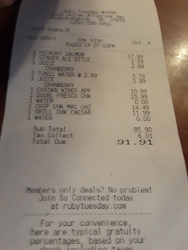 I am sad that I have to write this. This location should close for one to two weeks. The purpose is for training the entire staff. We arrived to this dead atmosphere. The parking lot needs to be repaved. It is dinner time at "Ruby Tuesdays" in "NC" and there are only a few cars in The parking lot. That should have been hint #1. I walk inside and I was the first to say good evening to the host. Realllly??? One should be welcomed into your eatery. That should have been hint #2. I informed her that I needed a table for 4. She said it would be a 20 minute wait. There were two parties already waiting a very long time to be seated before us. Hint #4. The restaurant was practically empty. Why was the wait soo long. One of the parties complained how they hated that location and walked out. Hint #5 (money loss). The other party was brought in and seated. A couple walked in 30 minutes into our wait and was seated immediately before US. The hostess forgot about us AND we were standing right there in their faces. Whose faces??? The hostess and the manager. They were having a non-work related conversation. Hint #6. (That is called ignorance. Money loss). I walked out with the expectations of going across the street to greassssseeeee Popeyes and my wife talked me back in to this devil's pit. Stupid me. After being seated, we were given a sweeeet, but un-fully trained waitress named Zion. I give "only" her 10 stars. She struggled with multiple tables while the manager and her sorry self along with the hostess remained in a deep un-work related conversation. Zion took our drink orders. I added my appetizer order which was $10.99 for 8 mini sized Wings, bourbon Style. It was served in a 4 inch wide skillet. I ordered a seltzer with a hint of cranberry juice. I was charged for not one drink, but for the two drinks (seltzer and cranberry juice) that barely filled my cup. Sad thing. I did not know this until I got my check. I blame the manager, not Zion. I should have been informed about the charges. The manager should have been training her. Although the wings tasted great, the charge should have been $5.99. My daughter ordered chicken tenders with pasta. Her meal was over priced and her plate was a child sized plate. She is 19 and was robbed. Zion could not have known this. She is a new employee. The manger should have been there. My wife ordered a salmon meal that was priced more than #13.. My grown lady received a child's plate. Reallly??? My youngest daughter ordered a large sized grilled chicken ceasar salad. It too was small. It too did not match the price. She asked the waitress for more parmesan cheese. The waitress did not know what is was. The manager should sit on a daily basis with the waiters and waitresses informing them about what's on the menu. Again it was not Zions fault. It was the magners fault. I ordered a chicken dinner which was delicious. Problem,,, it was plated with a small amount of broccoli, mashed potatoes, and two pieces of chicken. Although it was good, I still struggle a day later with the cost. Would you believe that our meals along with the drinks and appetizer costed more than $70? Welp. Yuppo. We paid it and we gave Zion a nice tip because she reallly deserved it. This message is for the owner. Ruby Tuesdays is/was one of my favorite restaurants. Please please please close down your restaurant for at least two weeks, hire and train new management, cooks, and keep Zion. You all need her there. With a little more training, she will be your new management. How do you as a manager stand around watching knowing that your waitress is stuggling without the intent of helping her. No one is receiving their meals. That should have been the big indicator right there. I will never ever go back again. I would like to end by saying thank Ruby Tuesdays for ruining it for me. Ohhh and do an upgrade on...