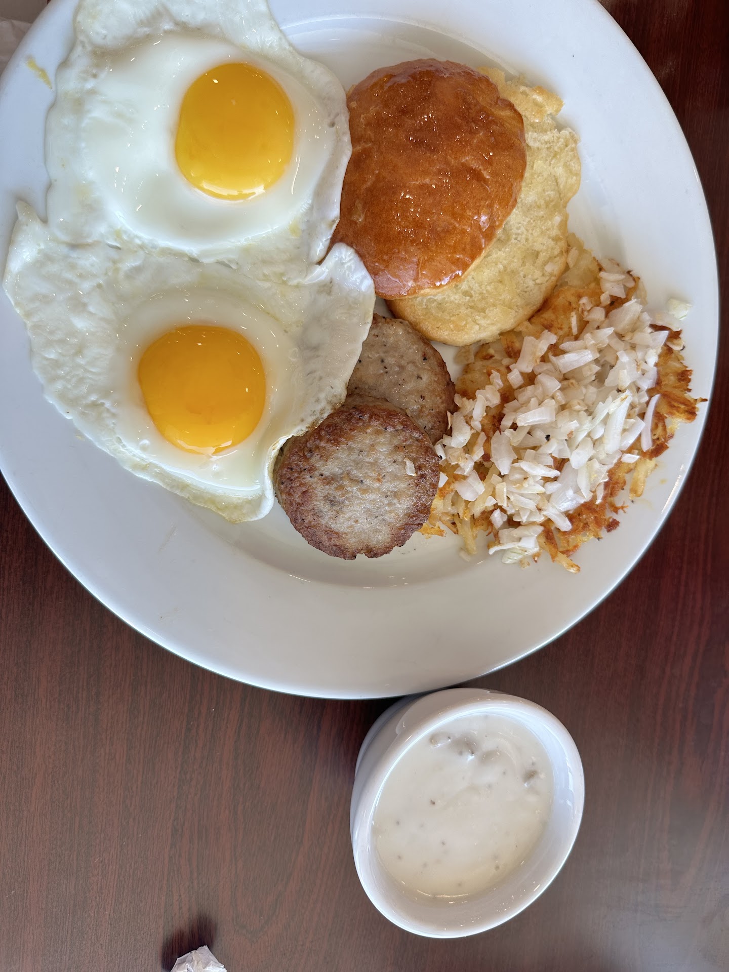 Read moreWe had breakfast here yesterday. My husband had the triple crown with his eggs scrambled. The menu says, your choice of waffle or pancake. He asked how big the waffles were. The gentleman said, “ oh, so you want the whole waffle?” 🤔 It says waffle not half of a waffle. He went with it. He loves waffles and was hungry. He does NOT prefer crispy bacon but for some reason the server entered the order as so even the extra bacon he ordered. I had the biscuits and gravy with the gravy on the side. Now it says biscuits, plural. It was 1. It was as if it did not rise. It was tough. The eggs were cooked correctly and were good. The sausage that came with the plate was mushy in the middle and not appetizing at all. The gravy did come on the side and when I went to stir it I was pleasantly surprised at the amount of sausage in it. So I dipped the “biscuit” into it and took a bite and the sausage was diced sausage patty that was the same mushy gross nastiness. I didn’t care for bacon so I asked for hashbrowns with grilled onions in them. The hashbrowns came with the onions on top, not a big issue. The issue was the mushy, no super mushy, frozen type of mess that seemed like a kid made them from a bag. I asked for them crispy. Which was not on the ticket as my husbands “crispy” bacon was 🤔My husband continued to eat and I pushed my plate to the edge of the table and the manager walked by twice and didn’t ask if anything was wrong, the server walked by once more during the meal. The manager finally asked if we were ready for our check and who our server was. He came and didn’t ask how our meal was. He asked upon dropping it off if it looked ok and that’s it. He asked if I wanted a box. I said no thank you. So because of the situation I was feeling out how they would handle it. I was always trained to do things differently. I’m not sure of this restaurants training procedure or the way the service industry in general in training people these days...