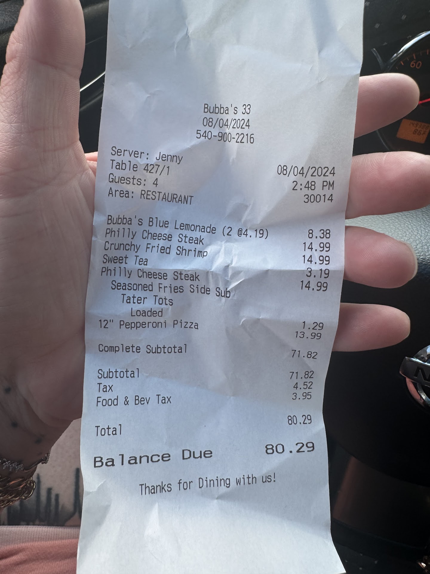 Read moreSo I really don’t know where to start with this. Today was our first time going to Bubbas. We knew it was a wait and waited 30 minutes after being told 15/20 minutes, which we were okay with. Well when we got sat down, we sat for 15 minutes before our server Jenny came to greet us. Initially very nice at first , she asked us was this our first time we explained yes. Well we ordered the bubba blue lemonade and waited another ten minutes for her to bring them back to us. She also had a very big party of guests we noticed. Well when we put our order in we asked for the loaded Nacho appetizer. So another 20 minutes goes by she comes back and takes our order. We had to tell her we wanted something else to drink because the lemonade tasted old. So we asked for sweet tea instead. Well she then brought me a unsweet tea and when I asked her where my husbands drink was she sighed like it was a problem. So then he had to wait another 5 minutes for a drink. During this time she literally went back and served her party table 7 times, I counted them. Then 48 minutuEs goes by not a check on us or our food, not a refill or a refresher on drinks. When some one did come out they brought the pizza we ordered which was cold, we had to ask them to take the appetizer off and tell who I assumed the manager was our order so we could get all our food! When we did get our food it was soggy and cold. He came right back with our food. So our food clearly had been sitting in the back and while JENNY stood and served her party table she refused to treat her other guests well! After the manager goes and gets our food she walks up laughing like girl I’m sorry I don’t know what happened to the appetizer I said it’s not funny and this is the worst service I received in a long time. So I will say this my daughter enjoyed her shrimp meal even though her fry’s were cold and a big piece of stem from some one cutting broccoli was left with it. Very disappointed and 80.00 dollars down the drain. The Philly cheese steak sandwich’s might have been good if they weren’t soggy and cold and I feel like managers should definitely help their struggling servers! Jenny had three other tables she just neglected and I hope Jenny didn’t get tipped from none of them ! Worst experience ever and I won’t be going back and hope who ever reads this gives me a full refund because clearly the manager me on duty were okay with the neglect that happened. Here is my receipt for my refund! P.s. the pizza was...