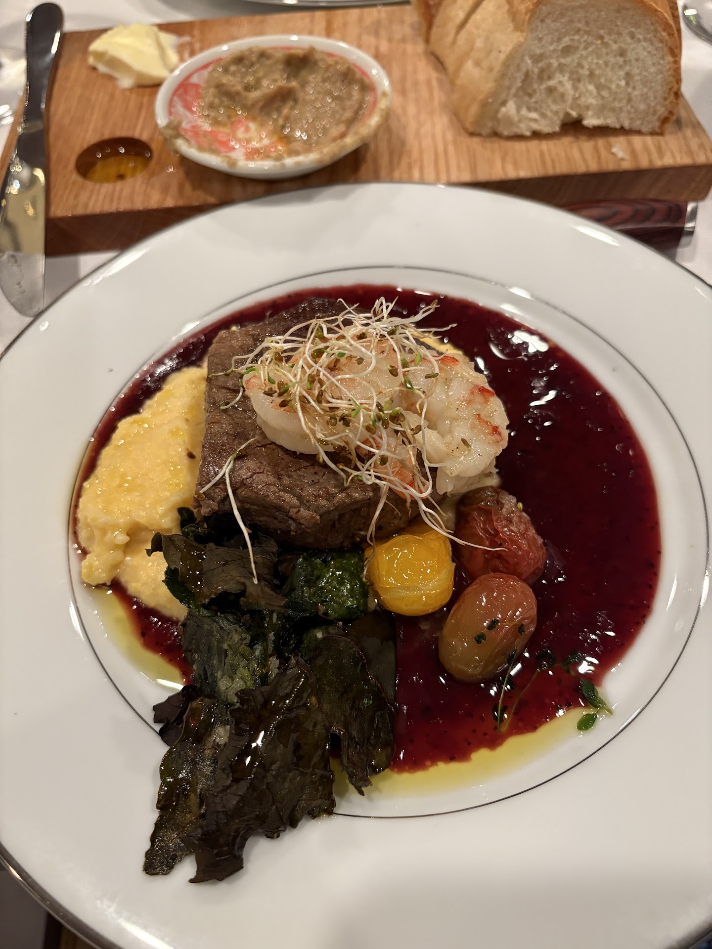 Entree was a perfectly-cooked beef filet, with polenta. Seasoning was in perfect balance, the dish had complete harmony.
