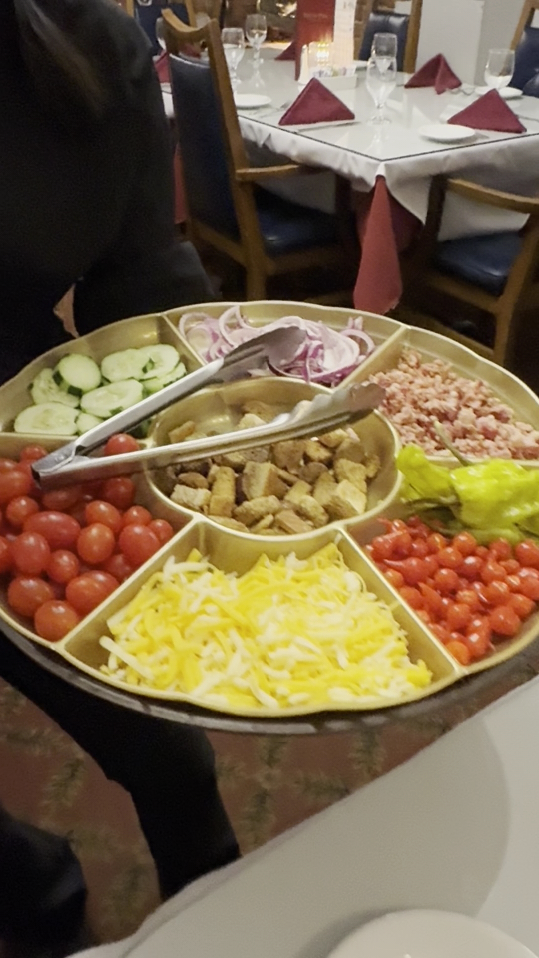 The bacon-wrapped scallops with tarragon sauce are always top shelf. I savored every bite. The salad was fresh and delicious. The bleu cheese dressing is one of the best I have had. The wonky presentation whereas the server completes your salad by presenting a lazy Susan with bacon, cheese, croutons, tomatoes, cucumbers, onions, and hot peppers is absurd and annoying. Just make the salad with all of the above in the kitchen and set it in front of me. Please.