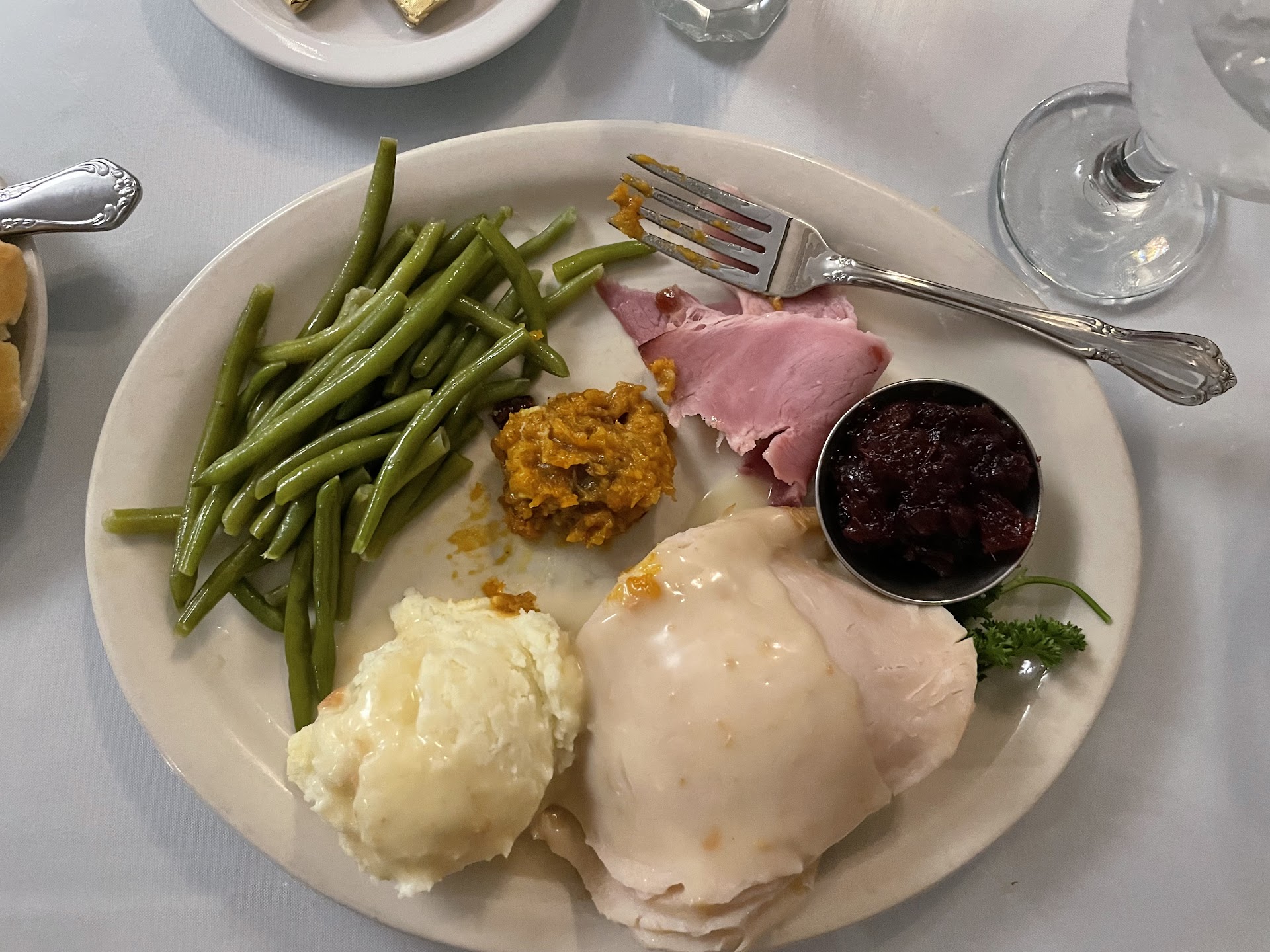 Read moreJust had Thanksgiving dinner at Coach & Four. I cannot adequately describe the poor quality of this meal, but I think it would suffer in comparison to a Swanson TV dinner. Their Thanksgiving meal consisted of a tossed salad of iceberg lettuce with two cherry tomatoes, a piece of turkey loaf (the slice folded in half in an effort to conceal the fact that it’s a circle of compressed turkey product) lying on top of a spoonful of Stove Top (or some other boxed product) stuffing, a tablespoon or so of runny instant mashed potatoes, a scrap of canned ham, green beans, a teaspoonful of sweet potatoes, a Sister Schubert’s yeast roll, and a slice of boxed pumpkin pie with a teaspoon of whipped cream. When I asked if they could hold the ham, our server told me that all the plates had already been made up, which is pretty interesting. She never inquired about our opinion of the meal, but as we were leaving, I did tell her that the food was bad, but I appreciated her good service, and I assured her that she would not see the poor food quality reflected in her tip. (I tipped 25% because of her upbeat, friendly service and the fact that she was working on a holiday.) She replied, “Really?! Everyone else is loving it!” I can’t imagine that too many people were excited about turkey loaf and instant potatoes, but there’s no accounting for tastes. I also ordered a watery cocktail (supposedly rum, peach Schnapps, cranberry and orange juices) for which they charged $13.95. With tip, my bill came out to be just over $80. I volunteered at RAM House this morning, serving Thanksgiving lunch, and that meal was far superior to this one in every respect. I’m not a Coach and Four regular, and I only made a reservation there because all other local restaurants were booked. This meal would not encourage me to try it again. Sub-K & W Cafeteria quality for eight times the K & W price....