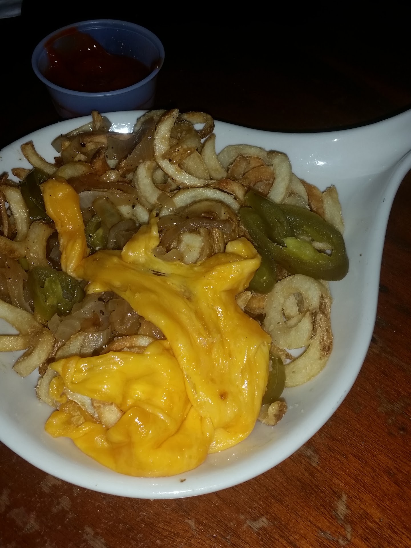 Walked in and the decor was kind of cool, brick walls and such, the restaurant was empty with all staff talking at the bar which is right at the front door - alright, the place is empty don't blame them too much - the girl at the door who seated us was dressed in a pretty but plain dress and was very kind. We were seated in the second of 3 levels in the empty restaurant - still fine, there were no small tables by the bar on the first floor - our waiter wore shorts, no name tag, and was very quiet, being quiet I understood and didn't hold it against him and he was polite and helpful. The chairs and tables had chips on them (wood chips not the food)