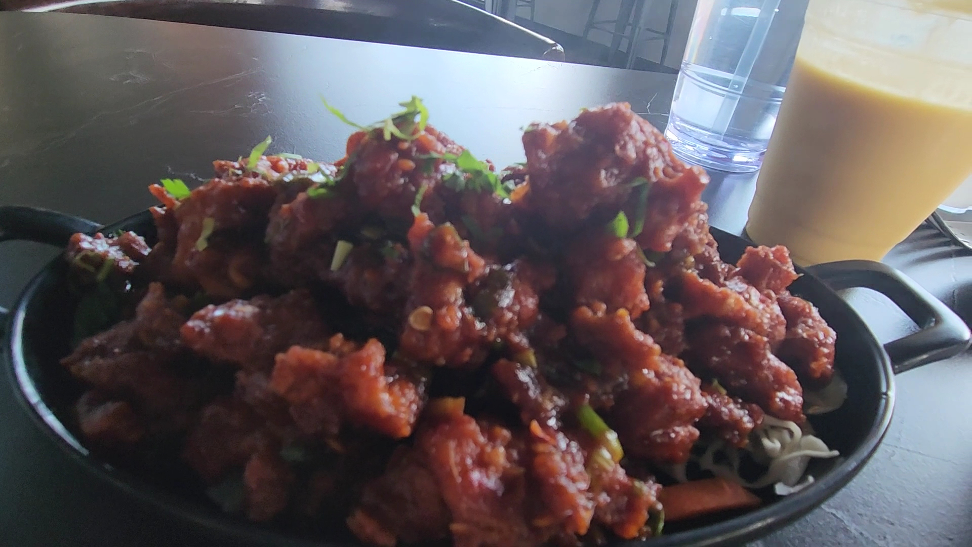 The portion sizes look a little small but everything is so flavorful and rich that it will fill you up. Everything is made from scratch, no pre-packaged spice mix or sauce packets. We first started with a spicy fried chicken dish. It was at the top of my wife's spice tolerance but we both really enjoyed it. For my main, I ordered a spicy goat stew type dish, again, super flavorful and somewhat spicy. The meat was tender, fall off the bone, but still juicy. My wife ordered butter chicken. The sweetness of her chicken balanced nicely with the spiciness of my goat. We also ordered garlic Naan and bullet Naan. They do not skimp on the garlic and both Naan were thin with great texture. The bullet Naan I think is supposed to have some spice....but to be fair, we had pretty much saturated our palates with spice on spice that I couldn't tell if it was spicy or not. Lastly, we had a mango Lassi, which the owner's wife made. This is a nice thick texture, smooth, and not overly sweet. A very good compliment to our dishes.