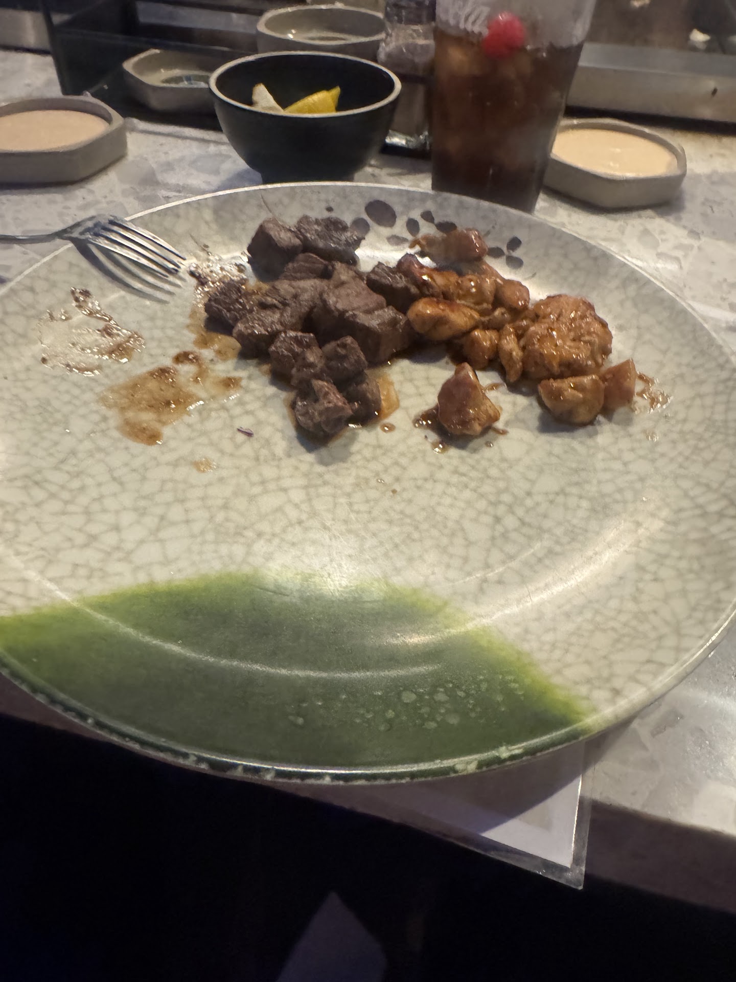 While the cook at our table was friendly and entertaining, the entire experience was marred by poor communication and unacceptable service. The portion sizes were shockingly small—barely enough for a lunch portion, let alone dinner. My wife ordered chicken as her main course, and it was such a small serving that I had to ask the waiter to give her my portion just so she could complete her meal.