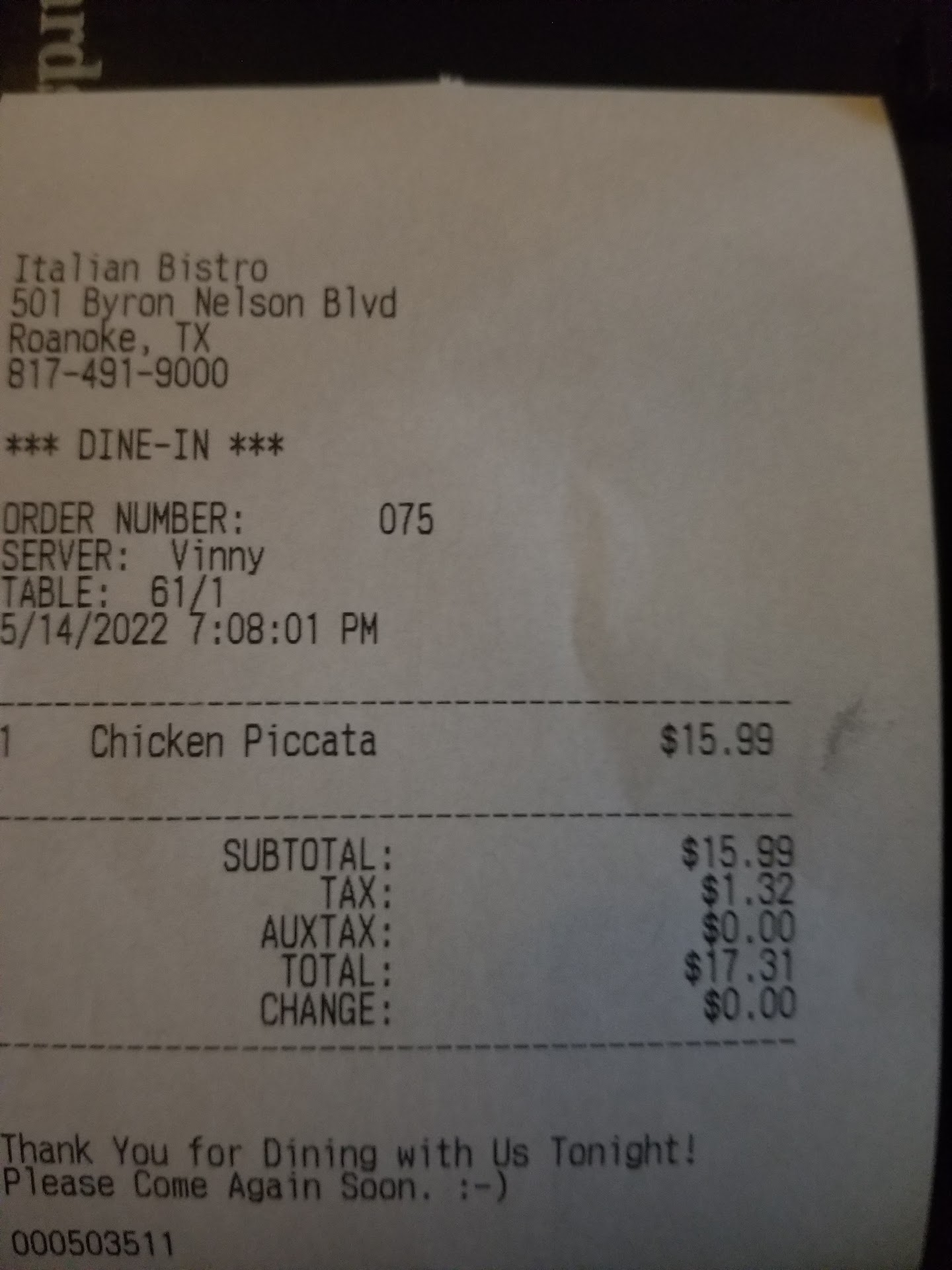 Read moreIf I could give it no stars I would. Have been coming here off and on for 10+ years but haven't in a while. Will NEVER come here again! I ordered Calamari, Chicken Alfredo, Manicotti and 3 Pasta Trio. The whole meal was horrible except for the bread. The chicken was albino while like it had been boiled not grilled and no flavor. The alfredo sauce was like water. The other dishes tasted like canned tomato sauce from the grocery and I don't even want to know what they use for ricotta. The Calamari was like rubber cuz it was over fried and greasy and hard. My grandparents came to this country from Naples Italy, I know what Italian food is supposed to taste like and this is far from it. I called the restaurant in regards to our meal and the manger I spoke with was apologetic but the owner wanted to speak with me and was very rude and disrespectful. Told me I was lying and that I needed to bring the food back if I wanted a refund. I said it's already in the trash where it's going to stay. Nor am I going to take it out of the trash and drive it back up there. And I will defiantly be leaving a negative review on this place. His response was I better tell the truth. I should have known when I wanted to order Cannoli's and they said they where out of filling and I asked them how they are making my Manicotti and 3 Trio pasta that all have Ricotta in it. Cashier said its made with cream cheese. Ummm no Cannoli's are made with Ricotta. Stay away from this place. Go to Vinny's in Trophy Club, the staff and owner are nice and humble and the...