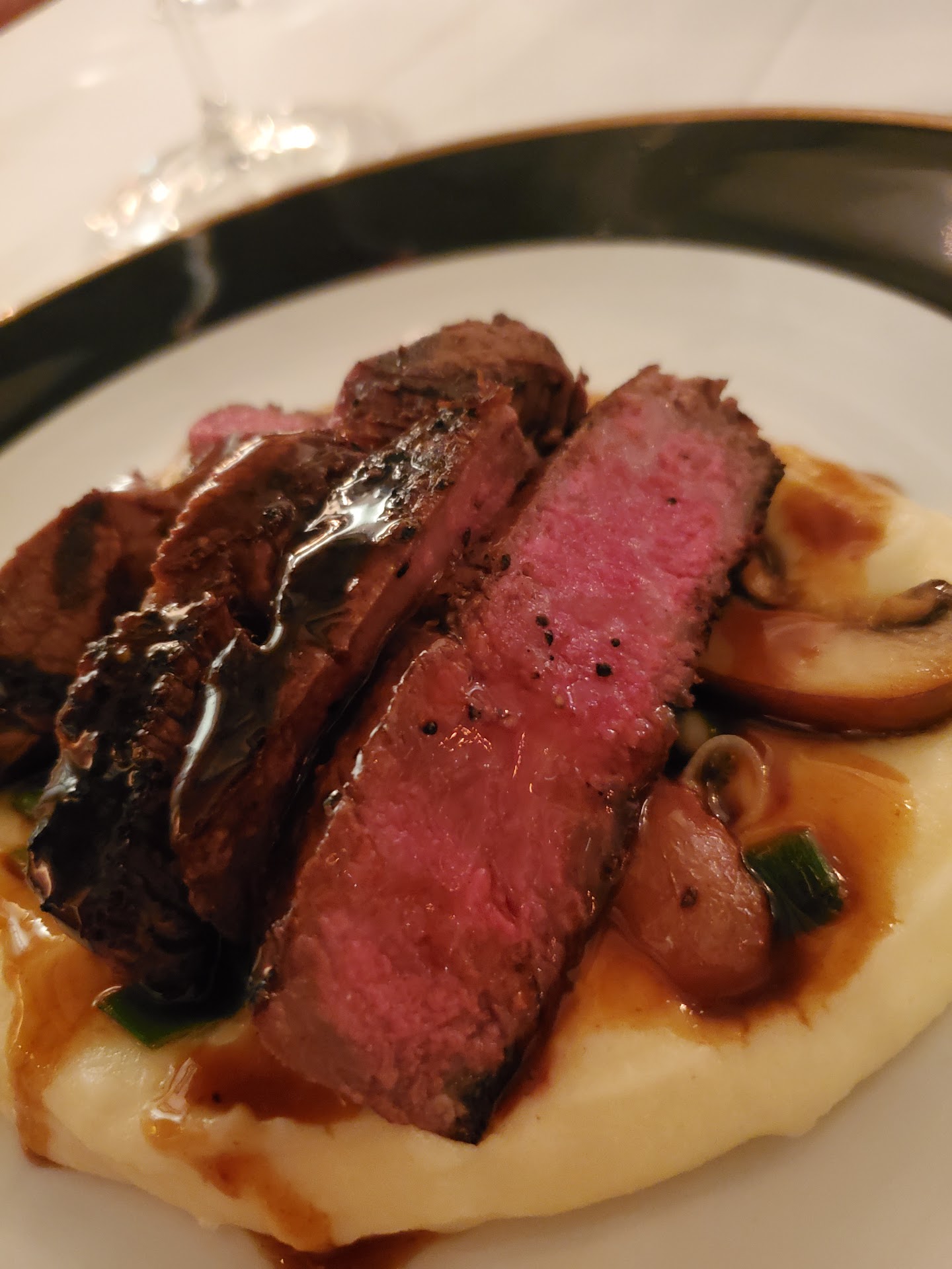 My mouth was watering as the steaks were dropped off and in hindsight, I'm not sure if that was because it looked appetizing or if it was because my body was trying to contend with its elevated sodium levels. First bite of steak was perfect. Finally, the chef redeemed himself. I make my way to the mashed potatoes and sauteed vegetables, which included cauliflower, carrots and parsnips. Not the nicest presentation as they were all mounded together under the steak with no delineation between mashed potatoes and vegetables, but whatever - it wasn't the star of the dish. First bite of that...no way. Total salt bomb. Seriously to the point of being inedible. At this point, I feel defeated.