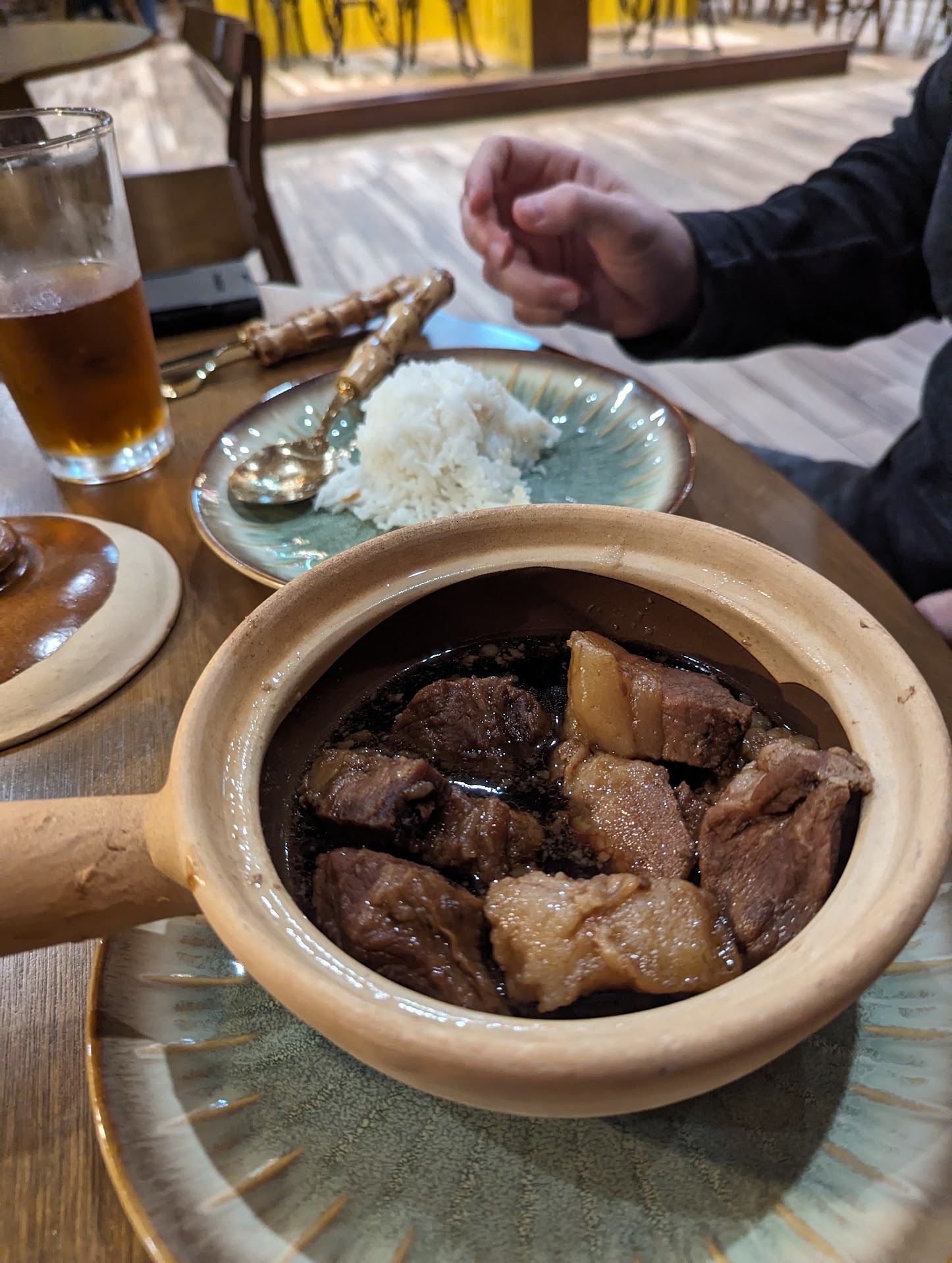 Service was lackluster at best. We walked in and asked for a table for two. The server who checked us in took us to a table and started to clean it off for us to sit. Then stops half way and just walks away. We stood there waiting, until another server came over and asked if we needed help. We told him the other gentlemen was cleaning the table and just left. So he continued to clean the table and seated us. Gave us the menu which is limited at this time due to the grand opening today. We ordered several dishes to try out. We got their Lotus Pho, Banh Cuon, Pork eggroll, Look Lac Beef(Shaken Beef) and Vietnamese ice coffee. Once our food came no one ever came back to check in on us. We had to flag people down just to get our check. Now this is normally ok since they were busy with their grand opening, but the owners and their friends and family and staff were sitting at the table right next to us. The staff were too busy chatting up and taking shots instead of checking on their customers.