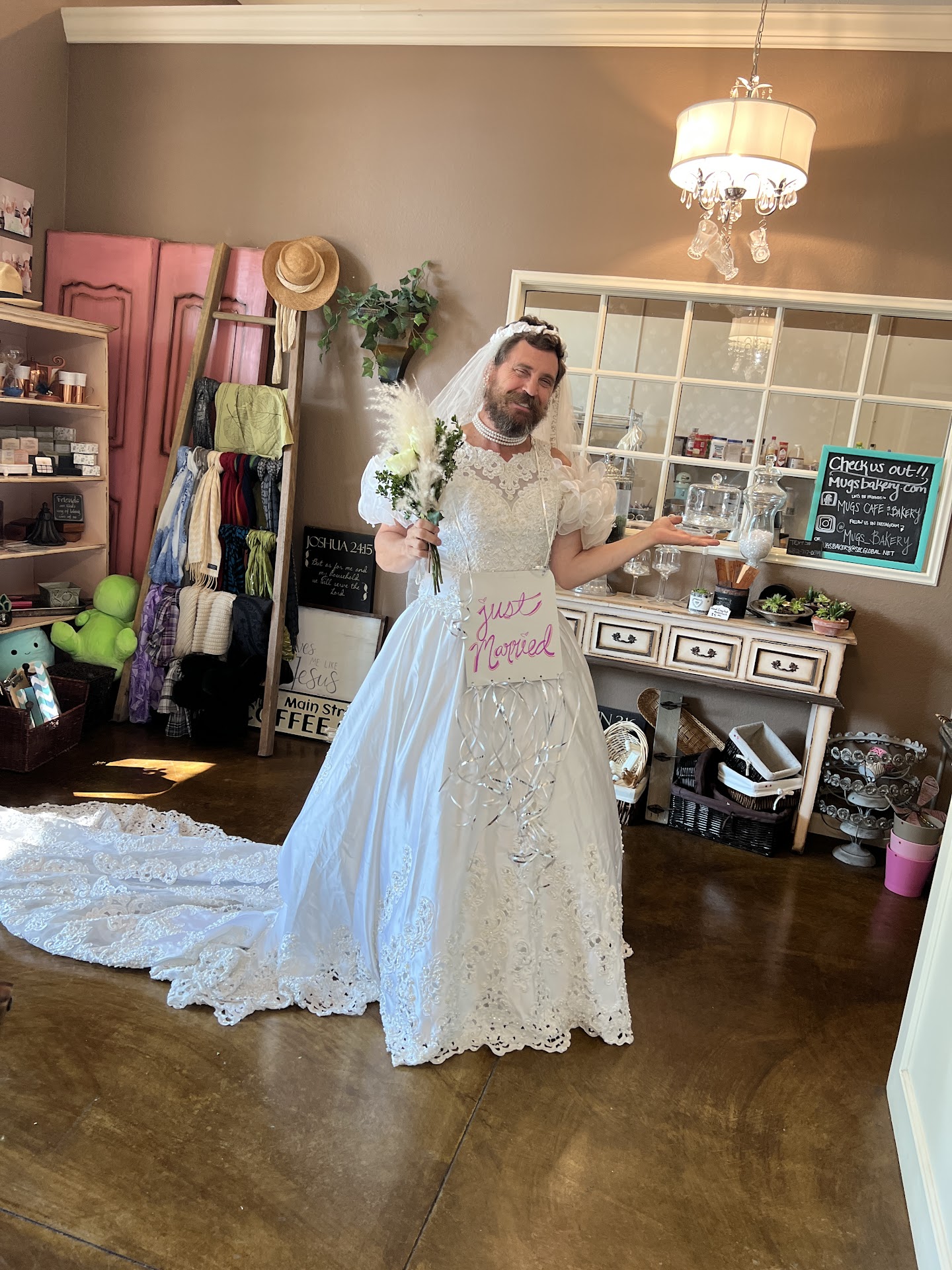 They went all out by making a "Just Married" sign for him, and the looks of astonishment and amusement from other customers were priceless. Mitch, with his full bridal gown, veil, and bouquet, looked absolutely ridiculous and couldn’t stop smiling, (and blushing) clearly enjoying being the center of attention.