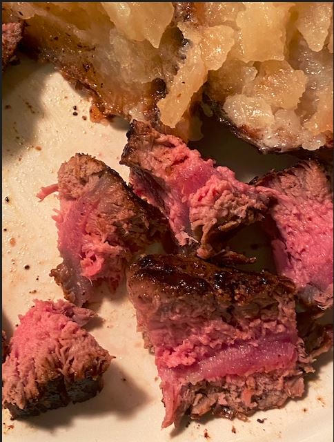My right hand is currently in a brace due to CMC issues and I am having difficult time using it let alone cook. Thought I would pick up a few meals for the weekend and was craving some steak. I looked and it seemed Outback reviews were improving so I decided to give them another chance. I had not ordered from them since November 2021 due to 4 bad experiences in a row. Bad food, missing food and special instructions not followed, etc.. Well big mistake on my part. Although all salads were included this time and look and taste good the no croutons was not followed for 2 requested nor was any extra dressing included that I requested - and I scoop of butter for my baked potato instead of the requested "everything".. Worst of all first steak I don't know what is going on with! Almost burnt on the outside but there is a sliver on bottom that looks like raw meat. It was chewy and yes it tasted raw. Don't even understand how that happened given how dark the outside was. Also from my picture you can see the baked potato is yellowish. As soon as I cut it open my first thought was old potato. And yes it was old.
