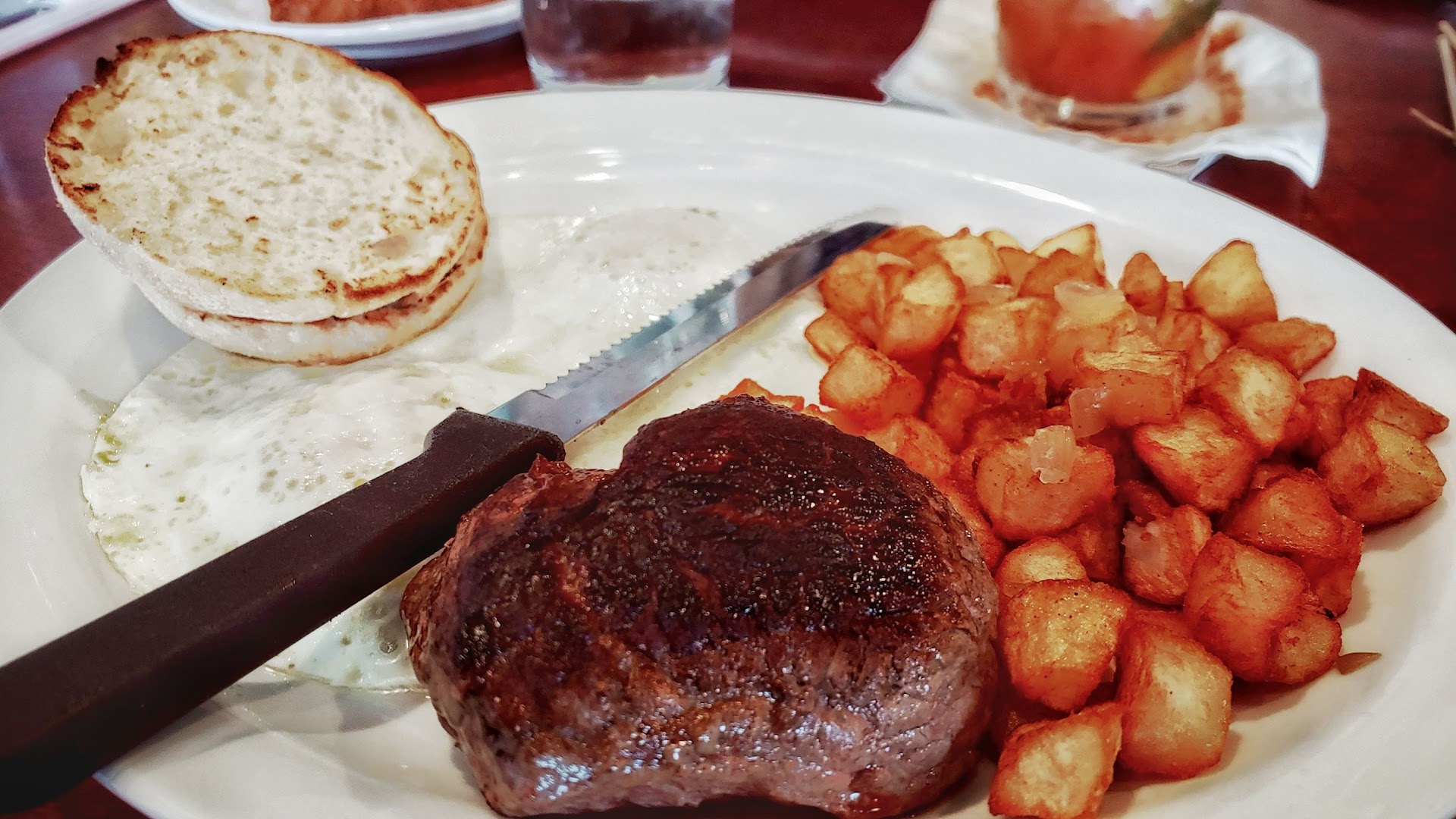 Read moreToday (1-15-21) was my first visit to Scrambled. We started the meal with two Smirnoff Bloody Marys (they also offer Tito's, but higher grade vodka is pointless in a B.M.) that were made with Zing Zang and garnished with lime, celery and olives. They were a great opener to the experience and our day. She ordered the Star City Scramble which includes two eggs any style, a side of meat (apple cider bacon in this case) home fries, and a choice of pancakes or vanilla French toast (she went with French toast). I ordered the steak and eggs, which includes a 5 oz. filet blackened or grilled (I went with grilled), two eggs any style (over medium) a side (home fries) and a bread (English muffin). My two issues with my order was that the steak - although cooked perfectly (I ordered it medium rare) - it seemed completely unseasoned. The home fries were good, but needed a little onion or something in the mix for better flavor. I sampled my date's French toast (though not a French toast fan) and it was actually quite good... I ended up taking more than one bite as the flavor grew on me. In the future, I'll more likely consider Scrambled as a location for brunch once in a while (due to the availability of adult beverages) rather than a regular...