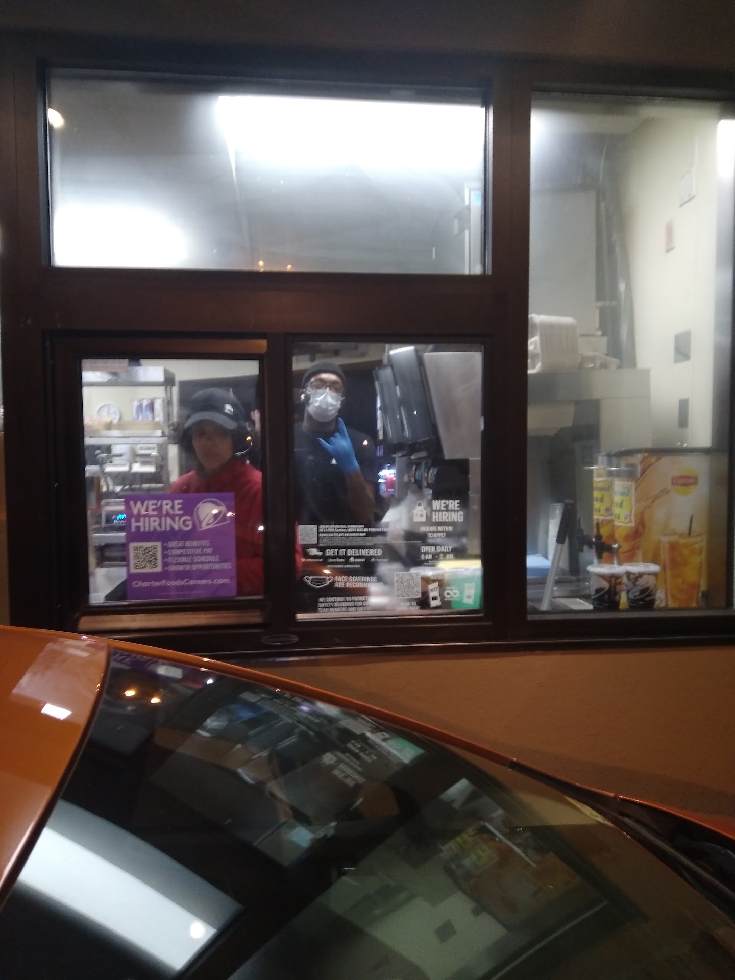 Read moreService at this location is incredibly slow. We’ve spent over 30 minutes in the drive thru on more than one occasion. You lock your lobby doors at random times, seemingly just whenever the staff feels like it. What’s the point of closing the lobby early exactly? Because I’m sitting in the drive thru line right now watching a couple of maskless men not in uniform, just wandering around the lobby on their phones. Not sure what that’s about but it’s clear covid safety isn’t the concern. I have so many complaints I don’t think they’ll all fit in this text box. The number of times we’ve come through and you’re “out” of what we ordered. Mind blowing. In the last 4 trips we’ve made to this location, you’re “out” of the items we order. 4/4 visits. That’s 100%. We’ve been told “nacho cheese takes 23 minutes” and we’ve been told this location doesn’t carry a certain item only to be able to order said item the very next day with no issues, which means the employees lied to us. When we do get the items we order, the cup is half filled. The fries are half full. Everything’s cold and soggy. There are no positives other than being able to get the food we want, even though the quality is so bad. When there are promotions, you “don’t have the blue raspberry flavoring” or you’re out of the item altogether. It’s always something. It’s infuriating to find out after sitting in a 45 minute line, that they don’t even have their menu items in stock. Get your life together, Taco Bell....