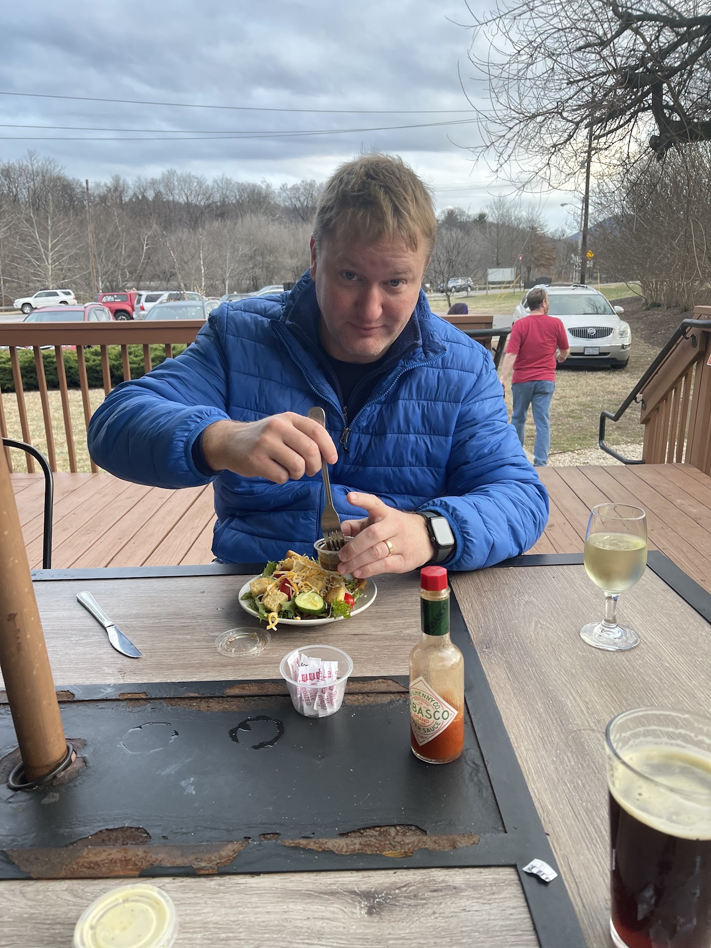 we got the eggplant fries but they had soaked up so much oil that they tasted mushy and soggy. our server said they were hit or miss with customers. my partner and I ordered separate pizzas, hers with the gluten-free crust and mine with the regular crust. I ordered the Goat pizza, with white sauce, goat cheese, bacon, and green apples and my partner ordered the Trestle pizza with red sauce, mozzarella, and fresh basil. even though the GF crust was about 12-13 inches vs 16 inches for regular, I wish I had gotten the GF crust instead. the crust itself was okay, but the pizza came drenched in oil, and not just on top. the whole pizza sat in a pool of either olive or canola oil on the tray, making it nearly inedible. I only ate one slice. our server said another customer had recently made the same comment. I ordered a local Parkway beer on tap to drink, and it somehow tasted slightly worse than it usually does out of the can. our server was very nice and attentive, and the outdoor seating had a nice atmosphere, although the angled bench seats can be somewhat awkward. we took the rest of the goat pizza home and dried out the slices with napkins, making it taste somewhat better. still threw away more than half of it though, but we ate all of the GF pizza.