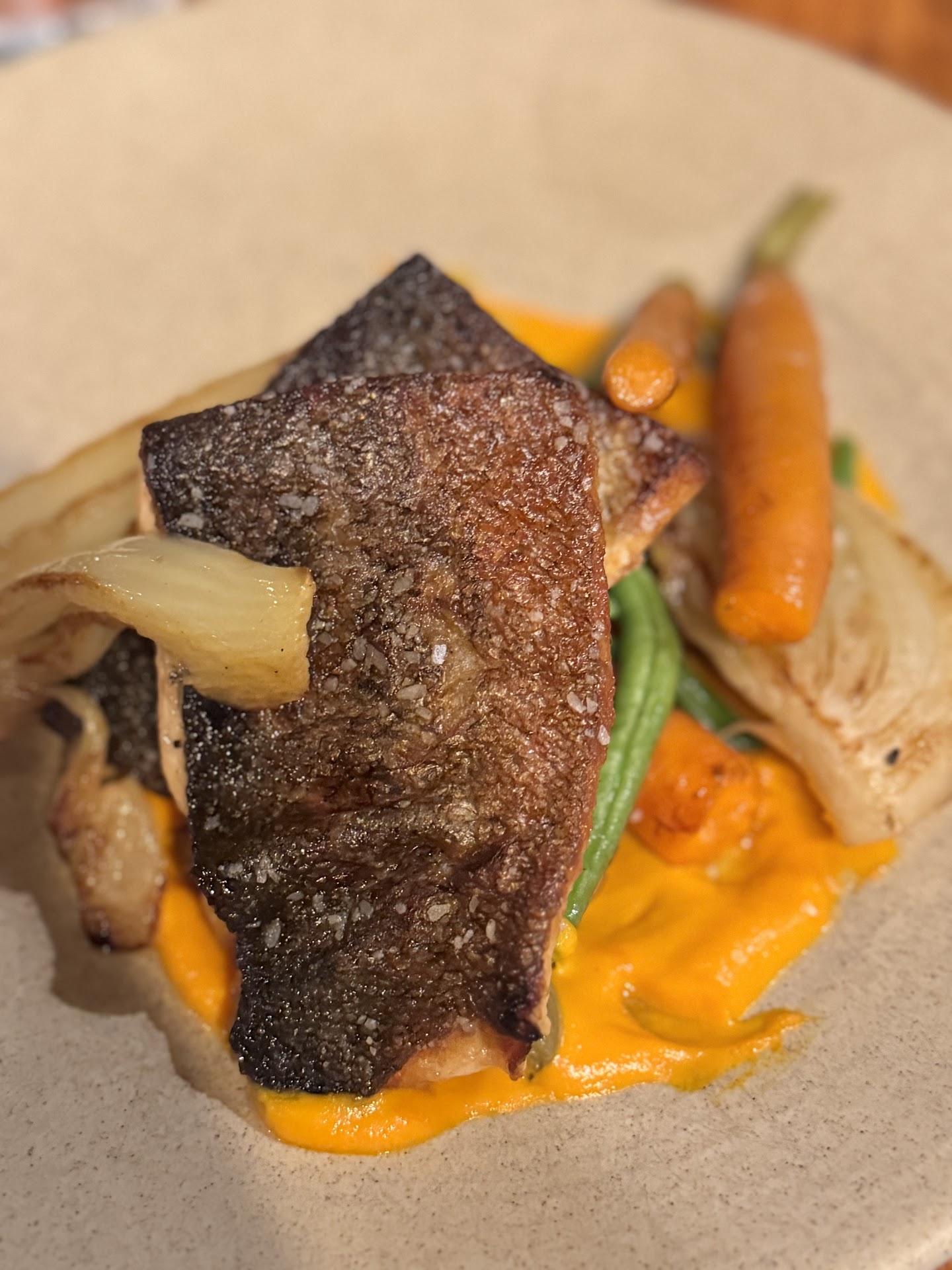 Felt like the entrees were the only thing that could save us. We ordered the most expensive appetizer and I ordered one of the most expensive entree. The oysters were better than expected for them being ‘out of season’, we grew up/own tons of property here but I went to college/lived at the beach for 10+ years and am a seafood fanatic. ‘Retired’ from fine dining in 2013 after 11+ years and the medium rare steak served was barely cooked, as if they flew it out. The server was great but indicated we needed to put in our entrees quickly - big no no for a newly established restaurant. The customers keep you in business so moving forward the restaurant should not offer a later reservation if the kitchen cannot accommodate. Had I known they were going to ‘fly’ my nearly $40 entree maybe I would’ve ordered more quickly. I then watched them prepare food for the next hour dually wondering why we were rushed to order entrees.