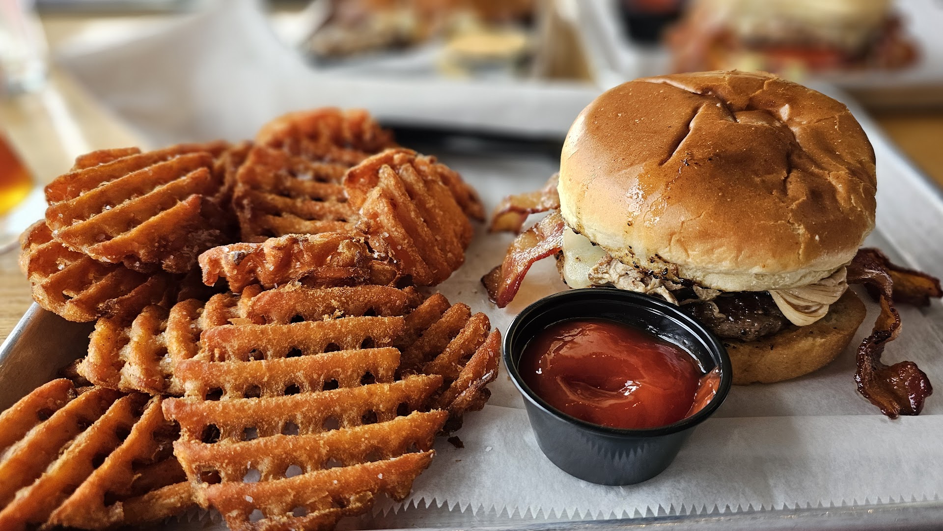 Food was kind of meh, though service was extremely fast due to the interesting and innovative system they have set up. Now, I donât usually have high expectations for food from any place that primarily makes and sells beer, but my burger was burnt to a crisp even though I asked for medium rare and they forgot all of my toppings. The only saving grace was the fries and the boneless wings. I donât see a lot of places use thigh meat for boneless wings and that really made all the difference, freakinâ loved those! More places should do that.