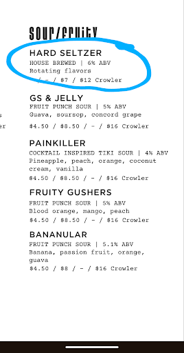 Read moreFirst time coming here. Ordered a non-alcoholic drink and was given an alcoholic drink, without realizing it. (I don't drink alcohol. My partner tried it and confirmed it had alcohol in it.) When I ordered I physically pointed clearly to the "Spirit Free" menu "NA Seltzer $4" and asked about flavors as it says they rotate. Server told me 2 options, I ordered one. Got it, drank it (tasted great). Thought nothing of it. Get the bill. It says "Hard Seltzer $7." I point it out to the server and say "But I ordered an NA Seltzer." She said "Oh, no hmm that's a Hard Seltzer" and pointed at my drink. I said, "Wait, there's alcohol in this?" She said, "Yes." ... My partner and I looked at each other, clearly upset, and I said, 'Oh, that's a problem..." She said quickly "Oh, I can take it off the bill, miscommunication on my part." ..And walked away... That was it. She's lucky I'm not alcoholic-in-recovery sober. I don't drink alcohol because it makes me feel like absolute crap. So, now I feel like crap. If I was her I would have been mortified by the "miscommunication" and comped the bill. I would acknowledge that my error could have destroyed someone's sobriety. Besides the food being great, the patio was noisy with music and a loud group at the communal table where we were sat. We won't be going back. See pictures. I'd suggest changing the language on the menu to not call an NA drink by a typically alcoholic beverage name, let alone a drink you actually serve (Hard Seltzer that is brewed there). This type of confusion could have devastating consequences. Now I know about the QR code. Wish I had used the QR code instead of interacting with a server who didn't want to be working and couldn't take an...