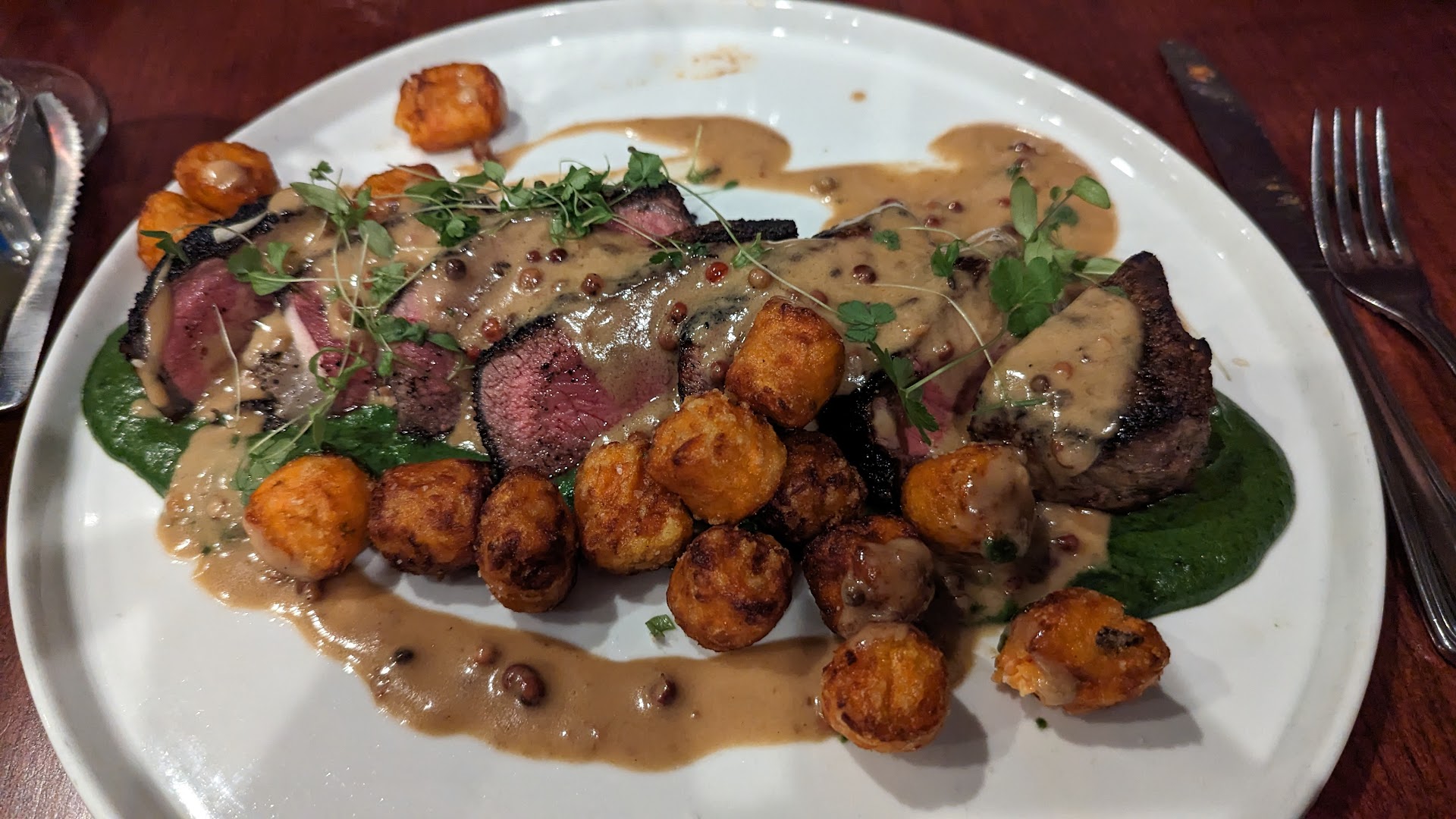 Read moreOur second time at Ravello by Toscano, the first one took place eight months ago. Again, very positive experience. Inventive menu by Executive Chef Dominic C., combining modern trends, exploration of and venturing into other world cuisines, new and bold flavors with the great traditions of cucina italiana. Carefully selected fresh ingredients by local producers, attractive plating, and very very generous portions. The menu features daily specials, including different steaks, expertly cooked. The prices are quite forgiving. Most pastas are priced in the low $20s (cacio e pepe is $18). We would particularly recommend the following dishes: short rib egg roll (braised beef short rib, Vermont cheddar, roasted mushroom bruschetta, truffle cream spinach), which even though being offered as an appetizer is capable of filling the hungriest stomach, grilled peaches and capicola salad and 14 oz steak, very reminiscent of Bistecca alla Fiorentina, served with deep fried squash florets and roasted potatoes. Good and friendly yet professional service, spacious dining area, ample parking and convenient location with a direct access to both South and North lanes of route 130. Highly...