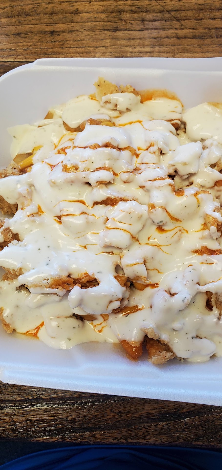 Read moreThe food was good but the service, not so much. I had to lower it a star just because of the service. Online it says they open at 10:30, we arrived at 10:35. We walked in and the place looked closed, all the mats and chairs hadn't been put down yet so I made the comment "oh they aren't open yet" a worker replies yeah we are, give me a minute. After she put down all the mats and the chairs, we stepped up to order and during the whole process the cashier just wasn't very friendly. It was almost like she was bothered by us being there that early. We ordered a Blazzin Buffalo fries with ranch on the side and another Blazzin Buffalo fries as it comes. My wife just doesn't like it when things are overly loaded with ranch, that's why she orders it on the side. As you can see on the pictures I had more ranch on mine than the "on the side" but they charged us extra for asking for it on the side. ?? We were sitting there waiting for our order to come up and I hear my name called, we were the only ones sitting in the restaurant but I turned around to say right here. When I turned around, I notice that she had just set our order on the counter for me to come and get. This is a very small place and they had at least four employees I could see, I would think she would have taken the extra six steps dropped off our meal and ask if we needed anything else. I know this is a long review but it's important for people to realize that this small town restaurant feel is not to be had here, it's more equivalent to a fast...