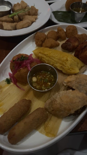 -Ajiaco (meat & vegetable soup, only available on Saturdays and Sundays) - this had some beef, pork, potatoes, and carrots. It was very flavorful and hearty. Perfect for a cold day -Ham croquettes - these were pretty standard, nothing to write home about -Chicharrones de Pescado (crispy bites of battered fish filet, served with tartar sauce) - the fish was good but I wish the batter was crispier. It was a little too oily -El Rumberito (appetizer sampler which included ham croquettes, corn tamale, beef empanada, corn fritters, crispy pork bites, and beef stuffed potato, served with homemade hot sauce) - the only thing I really liked was the beef empanada. The hot sauce is very heavy on the vinegar, which eventually grew on me because it helped cut out some of the greasiness -Pan con Bistec (grilled thin steak, lettuce, tomatoes, onions, and potato sticks) - although the steak was thin, it was still chewy and kind of bland. The bread wasn't that great