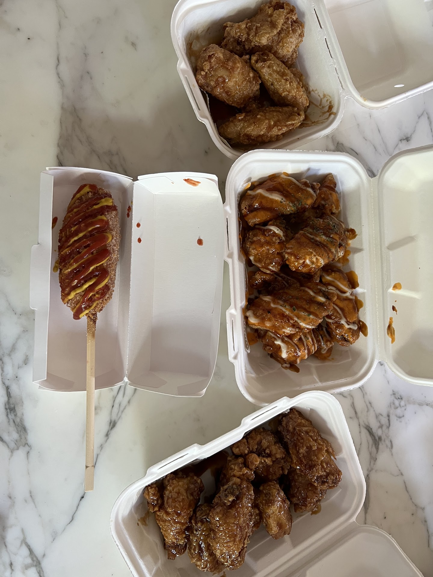 The honey butter chicken sandwich was decent but after a while of eating it, it starts tasting a bit too greasy and too sweet; portion was pretty good and sandwich was okay overall. One complain I have is that the sweetness is too overpowering. Another critique I have is about the size and portion for the chicken wings in general- 8$ for 4 extremely minuscule chicken wings is too much. Compared to other chicken places, the $/portion ratio is too much- you can get larger portions at a smaller price like at Seoul Box or any other local place. Not only that, the chicken was not prepared properly leading to a horrid and almost unbearable rotten smell. I apologize if I sound too harsh, but as a chicken place I think there are some standards to be met. The Jets pizza almost next door has better chicken wings for a much more cheaper price and at larger portions. Staff was kind and the corndogs were great- the chicken wings need...