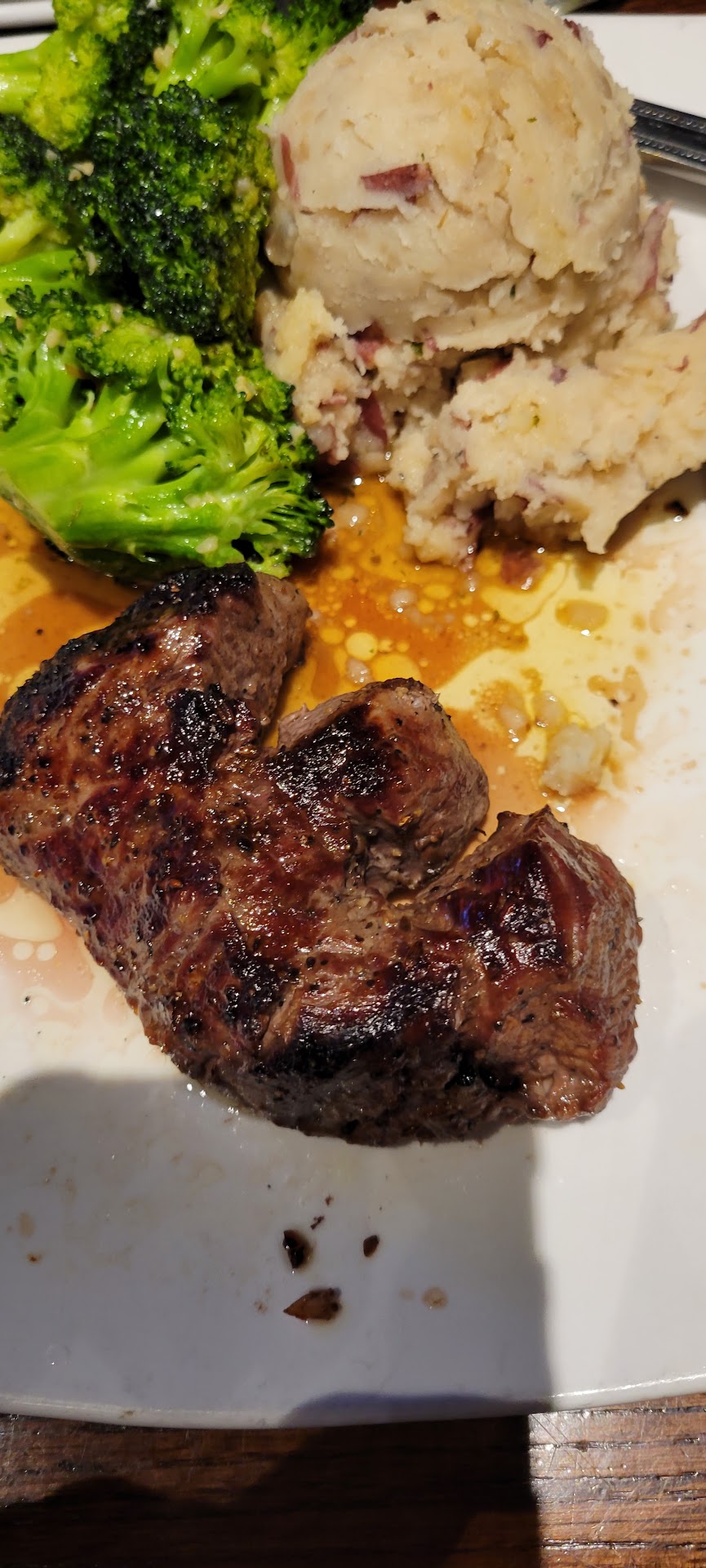 This was 2nd time here. The first time was good, but not great. Thought we would give it another try, and well, it was more of the same. The brussel sprout appetizer was amazing! But a lot of places had amazing brussels. I ordered a queen (smaller of the 2 offered) filet medium. It came with TWO cuts in it!! 1st pic. It looked like a letter E for crying out loud. So just for fun to see what it temp it was, I cut into it. Well done of course. It's a filet! Who cuts into a filet?! Our waiter looks surprised when I point it out to him and he takes it away immediately. He brings me a new filet, it does look nice. He waits while I cut into the center and... it's medium rare to rare. Pic 2 I just accepted it, I really just wanted to eat and felt bad for our poor waiter, Chris, who was doing his best! Nice kid. I ate around the edges and it was delicious! I took the rest to my husband who heated it up to a nice medium. The zip sauce is nice, but when it gets in the broccoli and mashed potstoes it make them all taste the same. While nice on the filet, it makes the broccoli and potatoes very salty. The chicken fajitas were good and the ribeye was delcious. There were a few other minor things, but no big deal. We tipped over 20% because Chris did a good job taking care of us, as untrained as he appeared to be. Overall though, it's just average. 𫤠oh! Edit here to say, I watched as a couple sat with their bill and money at the edge of their table. I watched the man politely try and get his waitress' attention 4 times (that I saw) and not once did she acknowledge him! Training is obviously lacking, as is management in general. I noticed there are NO responses from management/owners on any of these reviews. That tells me everything I need to know. I can't blame the staff, they are only as good as the managers...