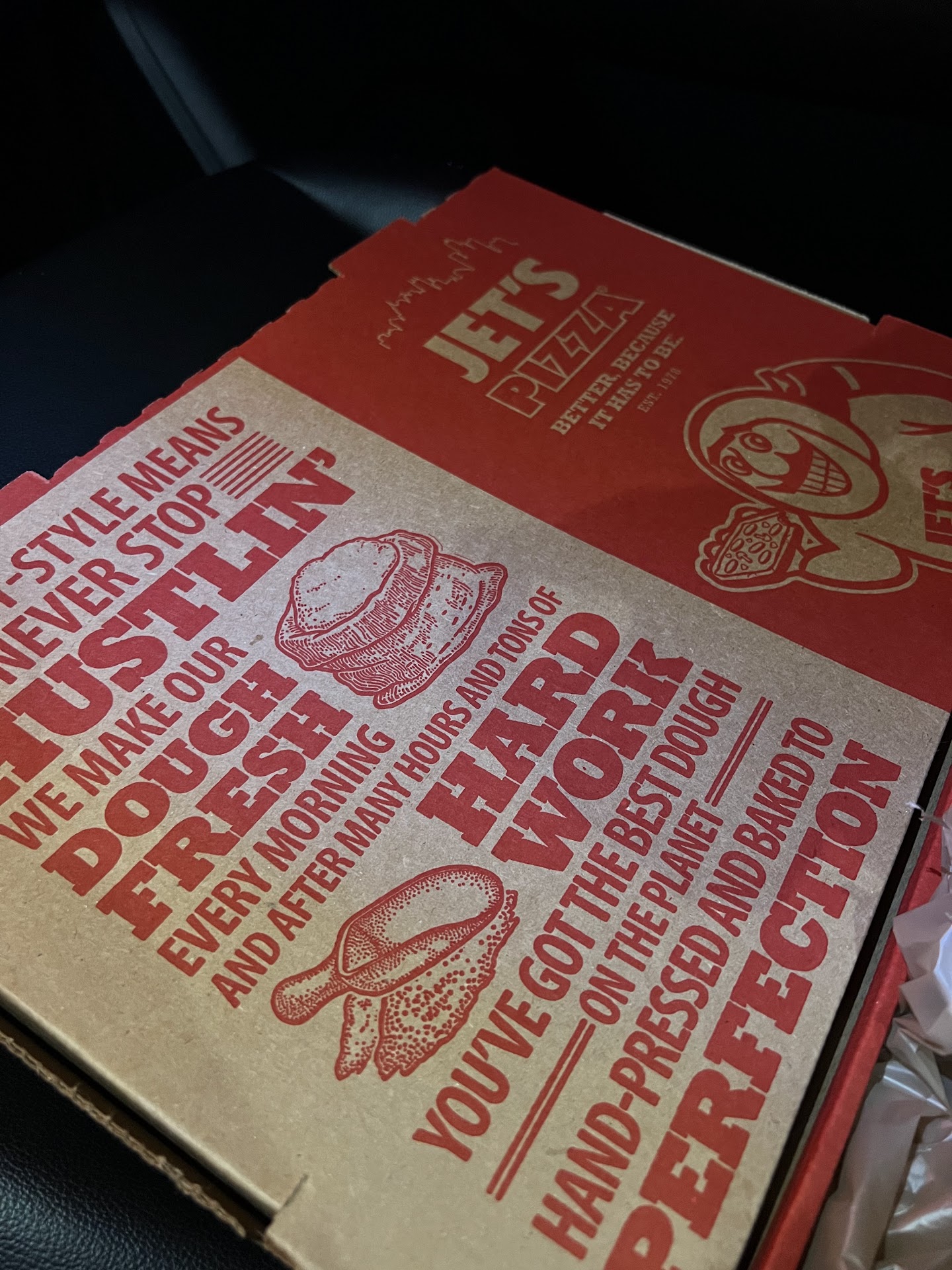 Read moreHad a few bad experiences and still tried them because they were convenient. Birthday party pizza was delivered VERY late and cold even after calling 2x and living 5 min away(didn’t do pick up because we had a lot of guests and didn’t want to leave them). Was contacted by corporate and tried them again. Pizza was just ok. Delivery was cold again. Tried them again after that and order was wrong even after employee confirmed order 2x. Pizza was just so-so. Called back and they offered to deliver the correct pizza but by that time it was just too late and quite frankly, it isn’t about a free pizza. I understand that things happen and that’s why we tried again and again but won’t be visiting this location again. Have had WAY better Pizza at other Jet’s locations and no problems either. Would rather drive further and out of the way to get better pizza from a different Jet’s or just order from a whole other...