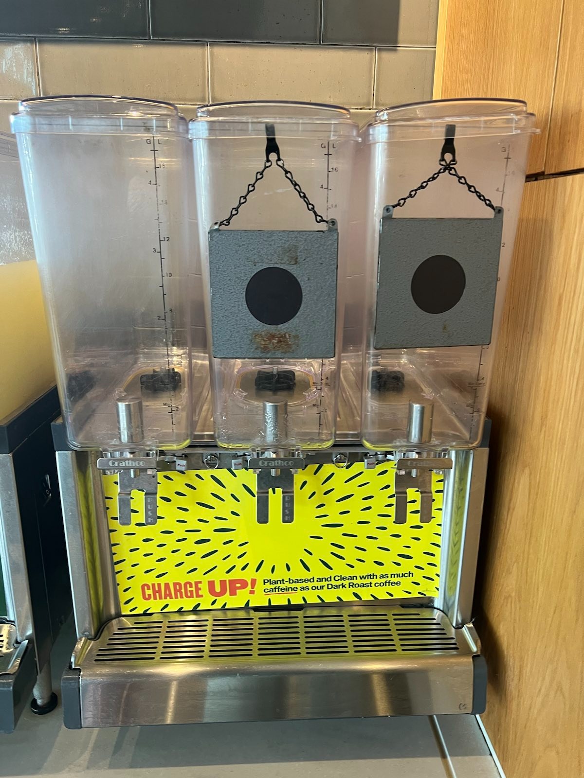 The charged lemonade station has been EMPTY for a month and the pop machine has been missing flavors for a month...occasionally they put out these really small pitchers w/lemonade that have saran wrap over the top of them and fruit flies all over them...pretty disgusting.