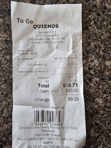 Read morePlaced an online order and paid. Come in to ask for my order as it’s not at the online order pick up and it wasn’t there so I asked the man for my order and gave him my name. He said he doesn’t have it. So I told him the order and he said it’s not there. Acted like I was stupid and said did you order from Quiznos.. then I said yes gave him my name and phone number and he ignored me to be on his personal cell phone and help other customers. Then I’m standing there waiting on my work lunch and I asked like are you gonna help me or figure out where my order is ? And he literally started laughing like “oh haha I don’t have it” and I said I don’t think it’s funny at all. Then I showed him the receipt. Then he goes “ohhhhh I know” and's pulls my sub out of the warmer. The owner should not have people like this running their store. I canceled my order due to the horrible customer service and...