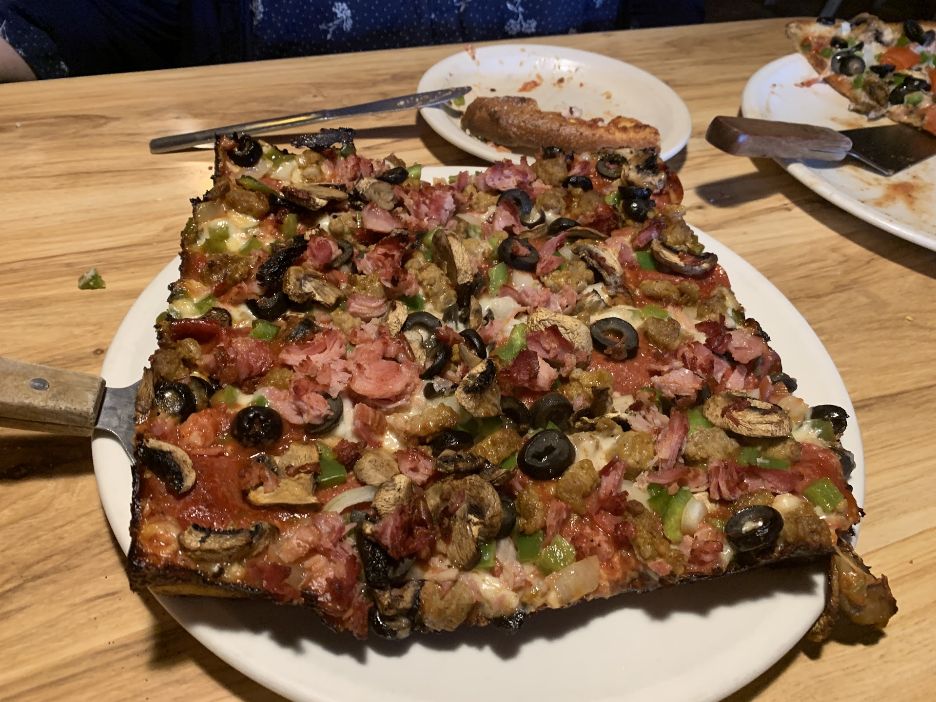 Today was our first time dining in here and the pizza’s were fantastic. We did do a couple of carry outs during Covid and at that time the pizza’s were good but nothing like what we had today. We did a small traditional round Veggie and a small square Colossal, both pizza’s were loaded with toppings and loaded with flavor ! The dough on the round was perfectly golden brown, not too thick, not too thin. Had just the right amount of a very tasty tomato sauce and nice fresh chunks of tomato and thick slices of fresh mushrooms along with onions, green peppers and black olives. I like meat on a pizza but I would have No Issues ordering this veggie pizza again and again. The square Colossal had a really tasty Detroit style crust with a hefty amount of pepperoni, sausage and ham along with fresh mushrooms, peppers, onions and olives and was Oh So Delicious. Both pizza’s had a great amount of toppings but they complemented each other perfectly, nothing was overpowering, everything blended together nicely and honestly… these were two of the best pizza’s we have had in quite some time ! The only thing I thought was going to be an issue (you can see in picture) was a visible amount of liquid under the veggie pizza I assume from the tomatoes, I thought for sure this was going to make for a soggy pizza, but not so, the pizza held up, never getting soggy at all. The owner was our server and even though he was pretty busy with several tables he made sure everything was just right with us and everyone else there. 5 Stars across the...