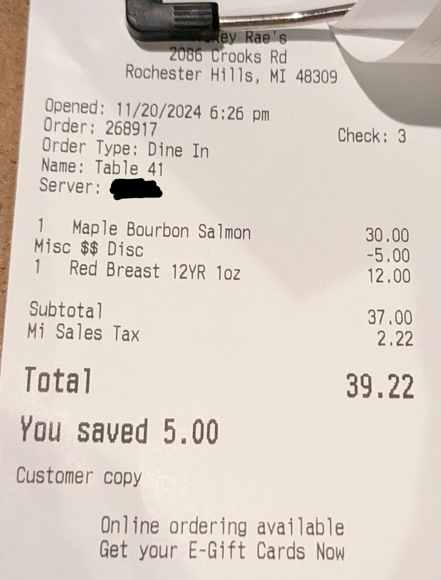 Read moreWent to Whiskey Rae's last night at the recommendation of friend because I am a whiskey drinker and they have a LARGE selection of whiskey. And they DO have a lot of whiskey's to sample. They didn't have my first 2 selections off the whiskey list (4-5 pages!) but I found one that I wanted and they had. We were there during "happy hour" but the whiskeys aren't included in the deal. :-( In fact, the whiskeys are truly way overpriced! Much more than I've paid almost anywhere. (It was MY bad but I got very surprised when the bill came. I "thought" I was ordering a $17 2-ounce pour of Oban 14. I read the whiskey list wrong. The 2-ounce Oban 14 was $33!!! I rechecked the whiskey list and I had missed it. I wouldn't have ever ordered it had I known it was $33.) We ordered a couple of appetizers as our dinner during the happy hour also. 25% off! But, alas, the 2 appetizers that we selected (tenderloin tips and wings) are NOT included in happy hour pricing. :-( We got them anyway and there were good. And the wings aren't drums or flats - you get 4 large ENTIRE wings from drum to the tip. I wasn't a huge fan of the rub they used but some may like it. The service was good (but we sat at the bar). The decor was so-so but we weren't really there for that. We did watch baseball, football on the screens above the bar and played Club Keno. We had a good time until I got the bill. Positives: Service, Food, Sports watching Negatives: Happy Hour disappointing, High Priced Whiskey We tried Whiskey Rae's and it was ok, but we...