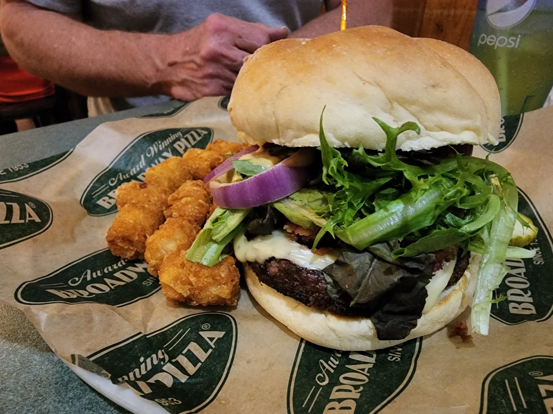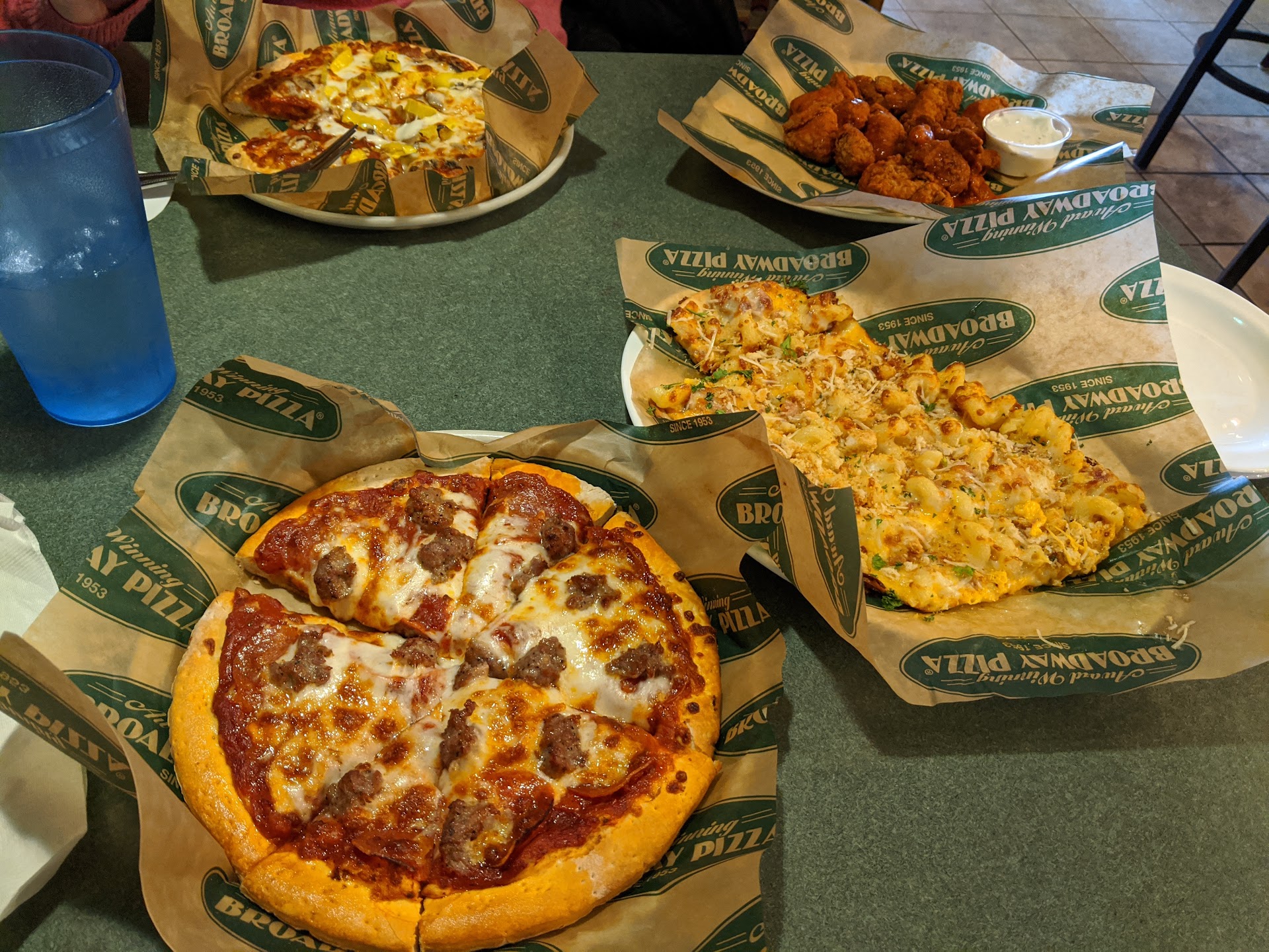 Read moreWe visited around 1pm on a Saturday. The place was fairly empty and we were seated immediately. Service was good. Soft country music played in the background. Our booth was comfortable and the environment was good for relaxing and chatting. The train quietly chugging around the restaurant was a nice touch. We ordered the 2 "solo" 9" pizzas (NY style), medium order of buffalo boneless wings, and the Not your Mother's Mac 'n Cheese Flatbread. The pizza sauce is tangy, almost like a pasta sauce. The sauce wasn't my favorite but my wife really liked it. The crust was a bit disappointing, it looks like one of those premade crust pizza kits you can buy cheap at Wal-Mart -a bit dry but certainly not bad. I understand their deep dish crust is better but that's not an option on their 9" pizzas. The toppings were good. Overall I thought it was a very "normal" pizza. I prefer Mr. Pizza but my wife prefers Broadway's pizza. The wings were alright. I would order them again. Like the pizza, nothing special. The flatbread was amazing. Everything we ordered was off the "happy hour" menu which came to a total of just over $30, an excellent value in our opinion. Overall this place is great if you just want to hang out with friends or family and get decent food but don't want to spend a ton of cash. Tons of different food options. They also have an affordable drink menu. We'll be coming back for their Wednesday night $30...